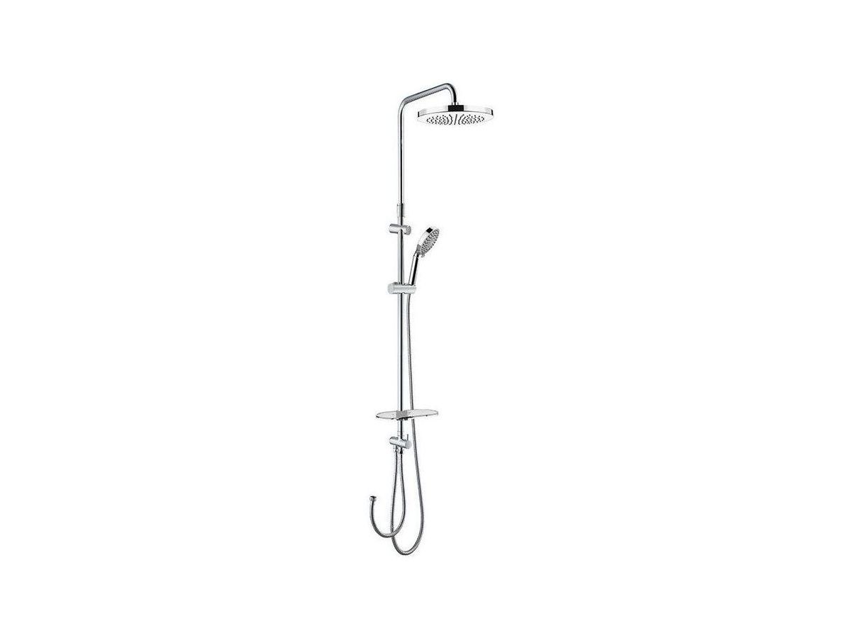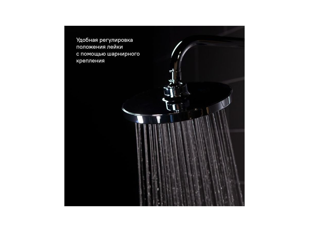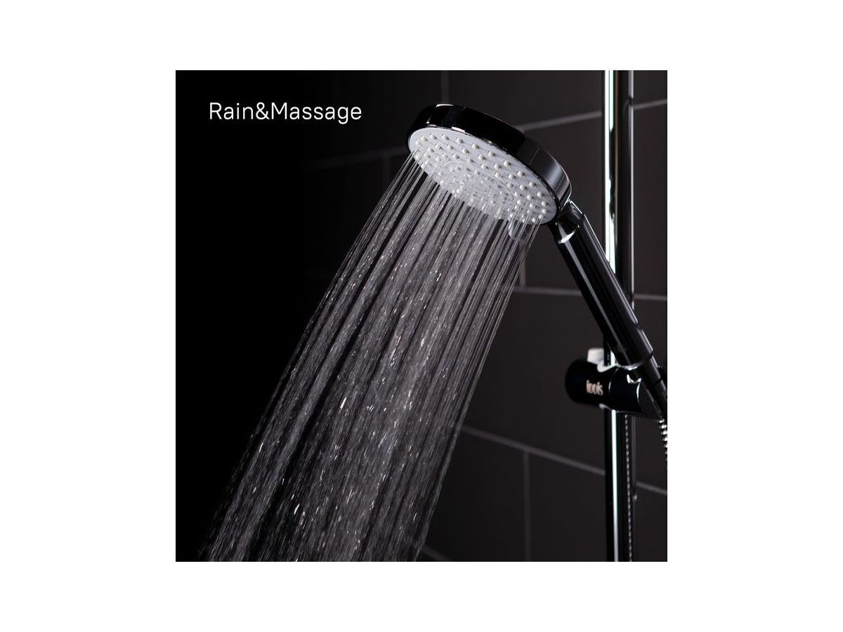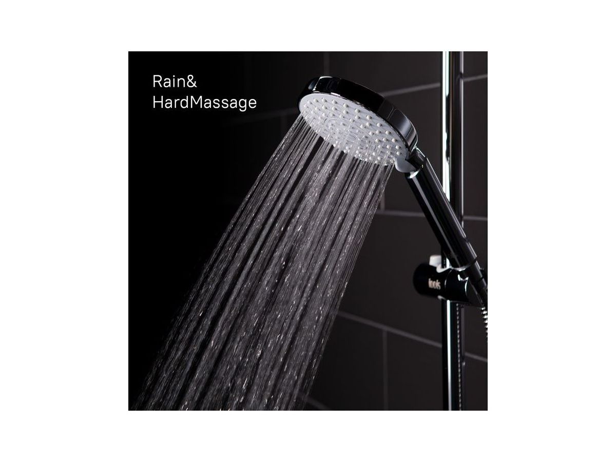 Душевой гарнитур с верхней лейкой. Ручная лейка с 5 режимами (Rain, Massage, Rain&Massage, Hard Massage, Rain&Hard Massage). Стойка: нержавеющая сталь. Верхняя лейка: ABS-пластик, диаметр 245 мм. Ручная лейка: ABS-пластик, диаметр 118 мм. Шланги: нержавеющая сталь, 1,5 и 0,6 метра, с системами Double Lock и Twist-Free. Поворотный керамический дивертор: три режима (переключалель верхний душ/ручная лейка/комбо-режим). Верхнее крепление стойки свободное. Телескопическая стойка, высота 860-1223 мм. Шарнирное крепление верхней лейки регулирует направление потока под нужным углом. В комплекте: вместительная полка из высокопрочного ABS-пластика, крепеж.