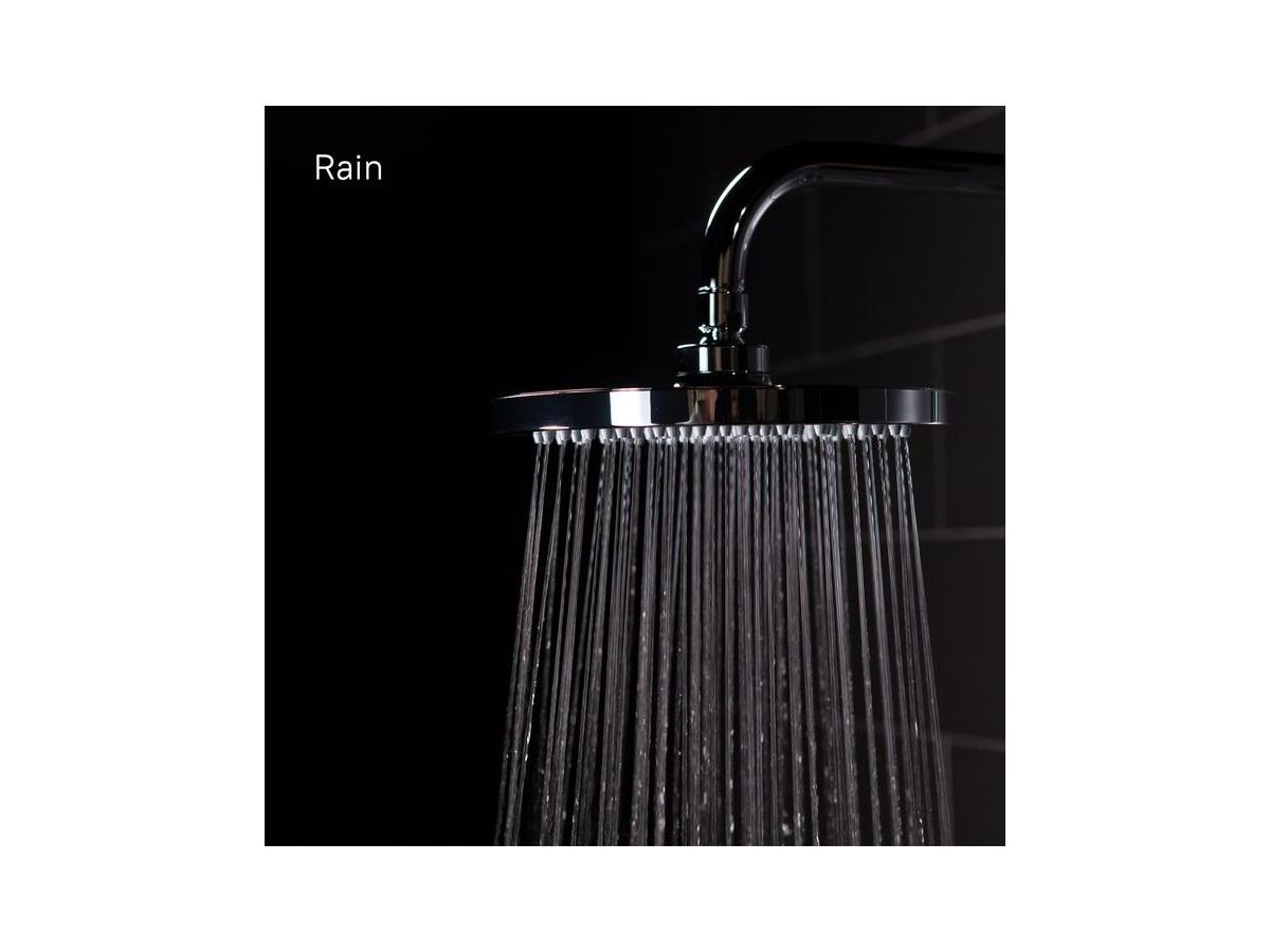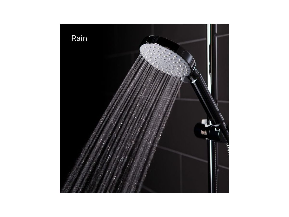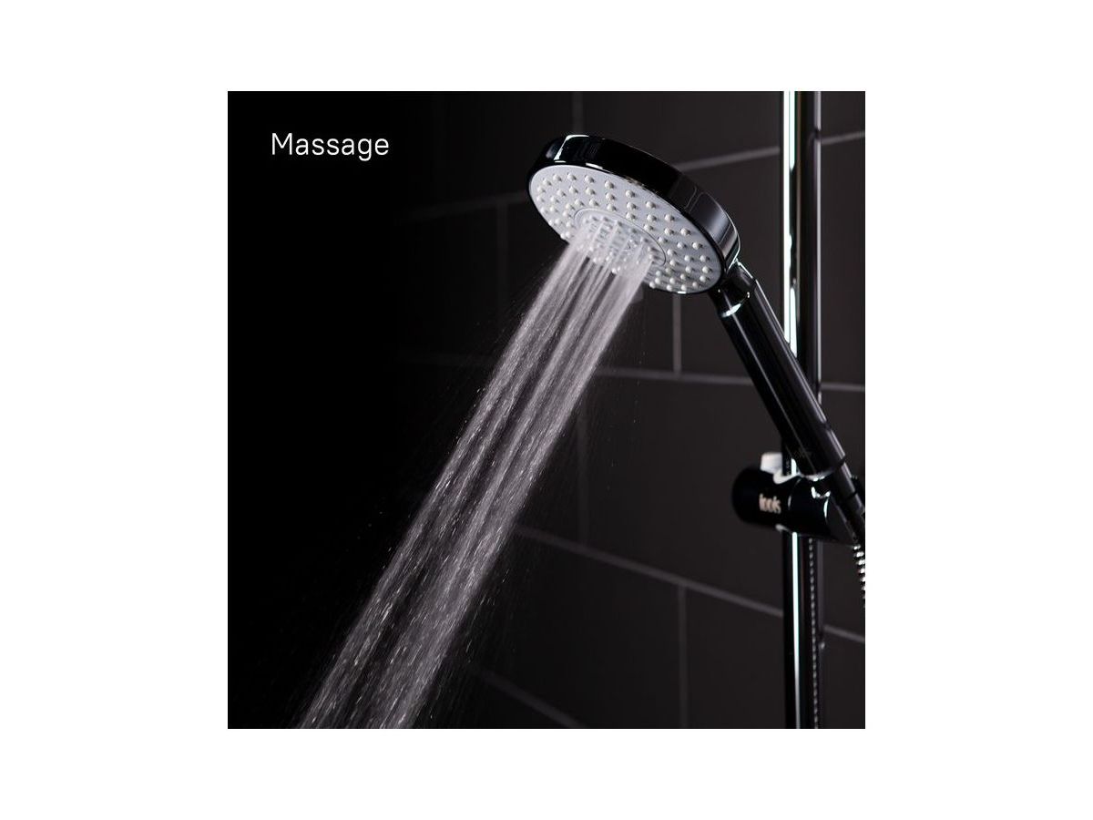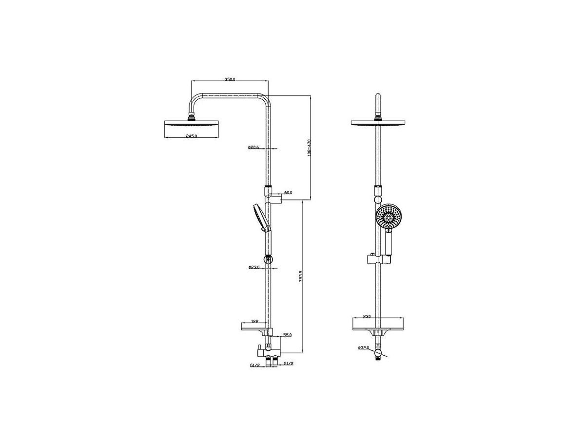 Душевой гарнитур с верхней лейкой. Ручная лейка с 5 режимами (Rain, Massage, Rain&Massage, Hard Massage, Rain&Hard Massage). Стойка: нержавеющая сталь. Верхняя лейка: ABS-пластик, диаметр 245 мм. Ручная лейка: ABS-пластик, диаметр 118 мм. Шланги: нержавеющая сталь, 1,5 и 0,6 метра, с системами Double Lock и Twist-Free. Поворотный керамический дивертор: три режима (переключалель верхний душ/ручная лейка/комбо-режим). Верхнее крепление стойки свободное. Телескопическая стойка, высота 860-1223 мм. Шарнирное крепление верхней лейки регулирует направление потока под нужным углом. В комплекте: вместительная полка из высокопрочного ABS-пластика, крепеж.