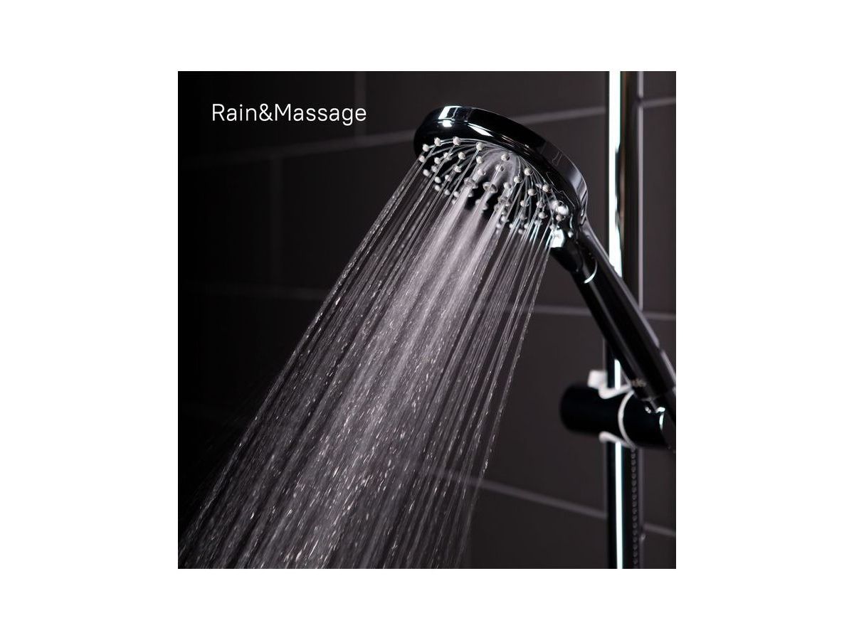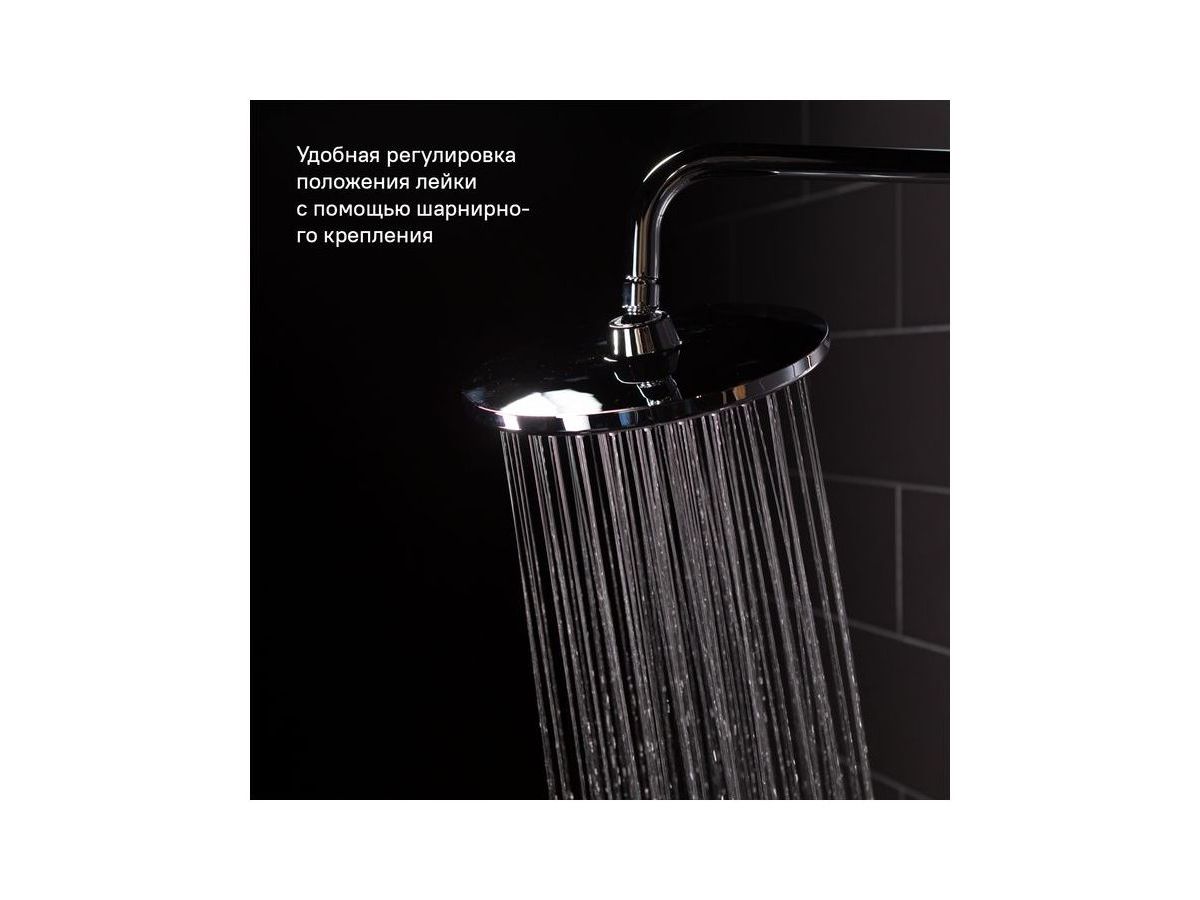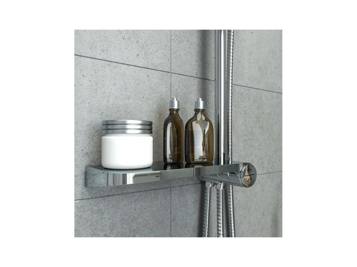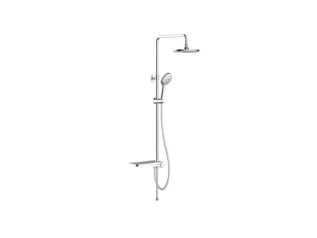 Душевой гарнитур с верхней лейкой. Хромированная полка и хромированные лейки. Стойка из нержавеющей стали диаметром 24 мм. Телескопическая стойка, высота 800-1100 мм. Ручная лейка с 3 режимами (Rain, Massage, Rain&Massage), кнопочное переключение режимов, цвет хромированный, диаметр 110 мм. Верхняя лейка хромированная, 1 режим, диаметр 220 мм, шарнирное крепление. Хромированная полка из ABS-пластика с кнопочным дивертором. Два шланга ПВХ в оплетке из нержавеющей стали: 1,5 м и 0,5 метра. В комплекте: крепеж.
