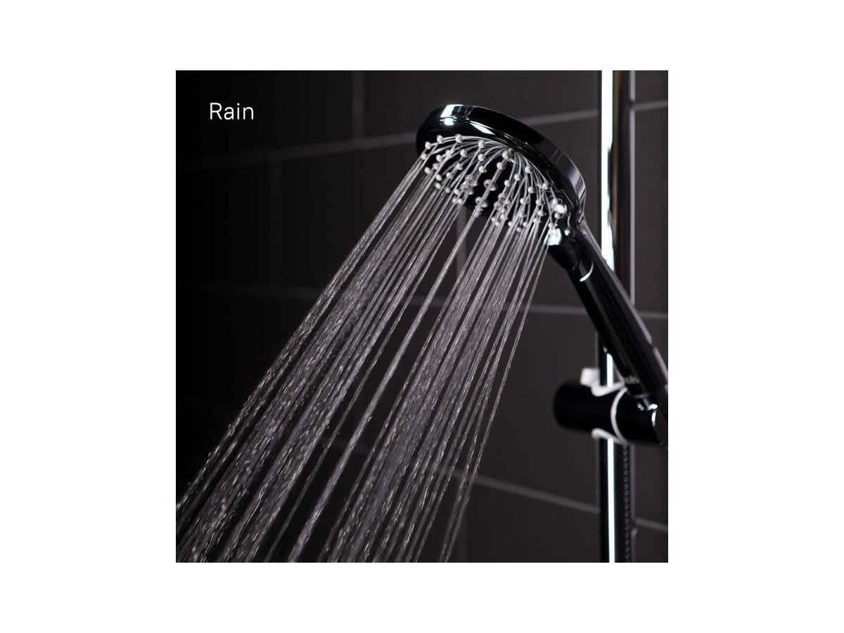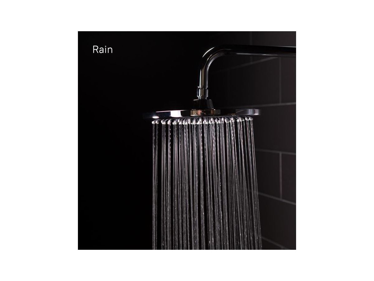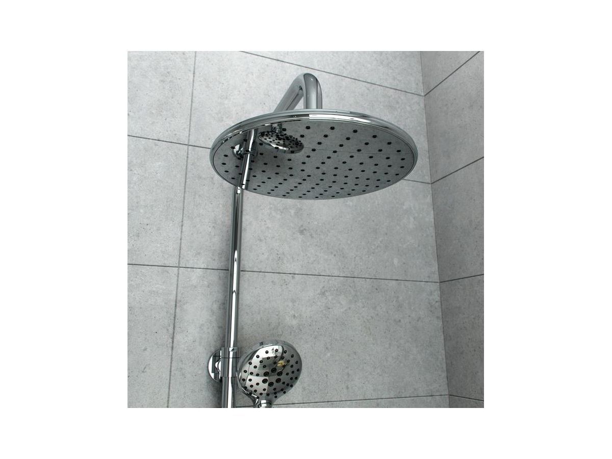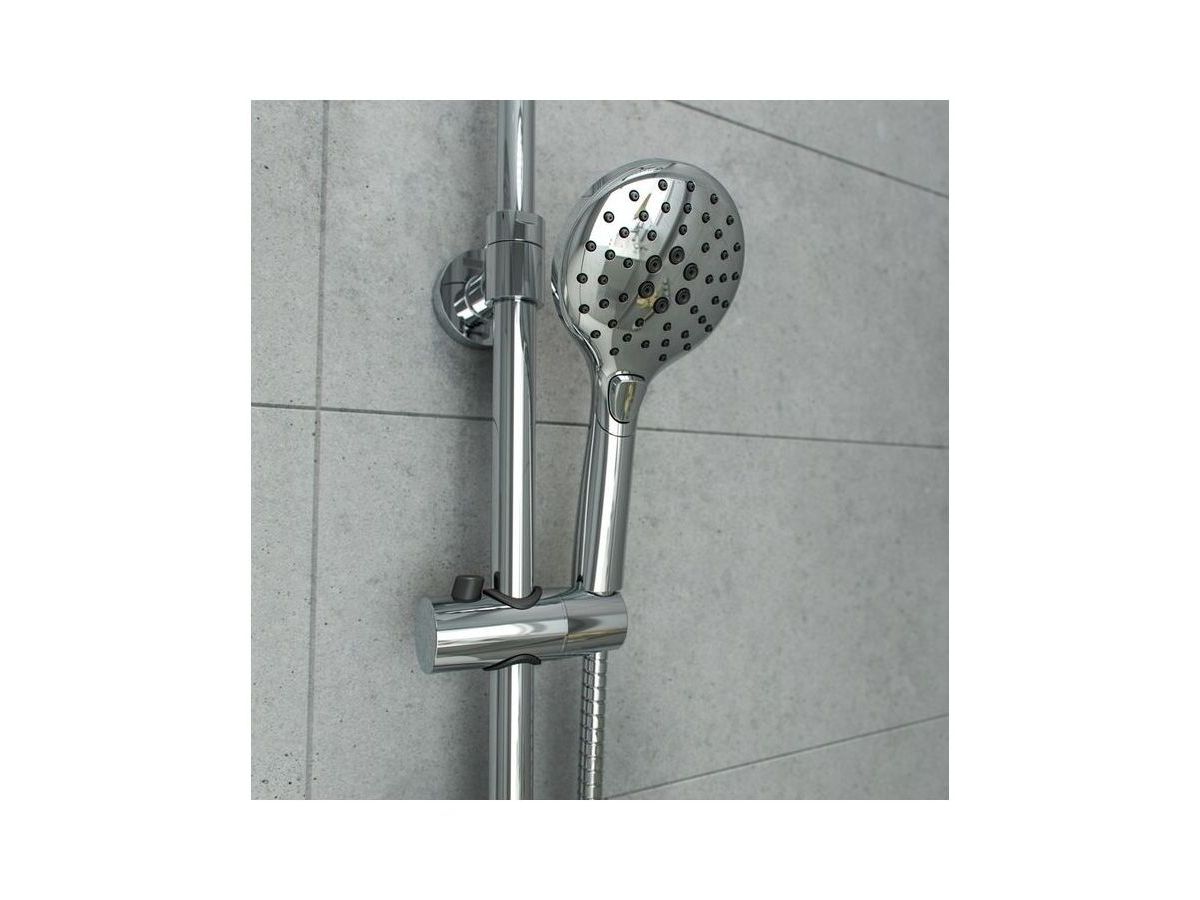 Душевой гарнитур с верхней лейкой. Хромированная полка и хромированные лейки. Стойка из нержавеющей стали диаметром 24 мм. Телескопическая стойка, высота 800-1100 мм. Ручная лейка с 3 режимами (Rain, Massage, Rain&Massage), кнопочное переключение режимов, цвет хромированный, диаметр 110 мм. Верхняя лейка хромированная, 1 режим, диаметр 220 мм, шарнирное крепление. Хромированная полка из ABS-пластика с кнопочным дивертором. Два шланга ПВХ в оплетке из нержавеющей стали: 1,5 м и 0,5 метра. В комплекте: крепеж.
