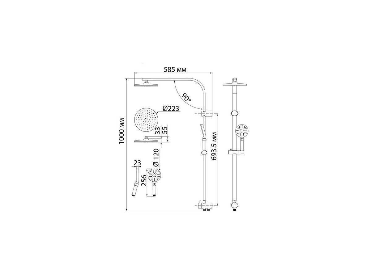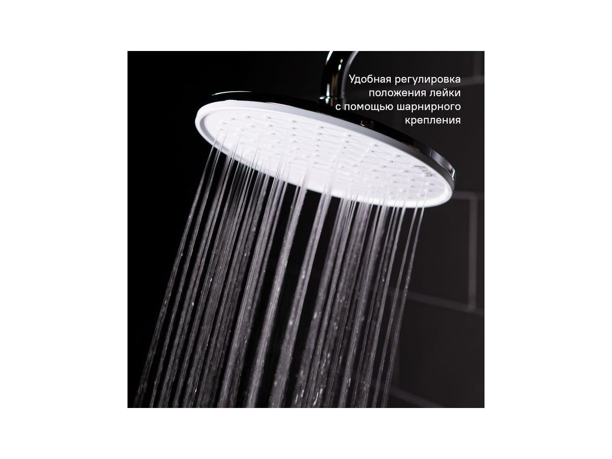 Душевой гарнитур с верхней лейкой. Стойка из нержавеющей стали с никель-хромовым покрытием, высота стойки 970 мм. Материал корпуса дивертора - ABS-пластик. Шланг для душа из ПВХ, 1,5 м и 0,6 метра, цвет серебряный, с системой от перекручивания Twist Free. Верхняя лейка из ABS-пластика, диаметр 225 мм, хром/белый матовый. Ручная лейка из ABS-пластика, диаметр 120 мм, хром/белый матовый, 3 режима (Rain, Massage, Rain&Massage), переключение на ручке с помощью слайдера. В комплекте: крепеж.