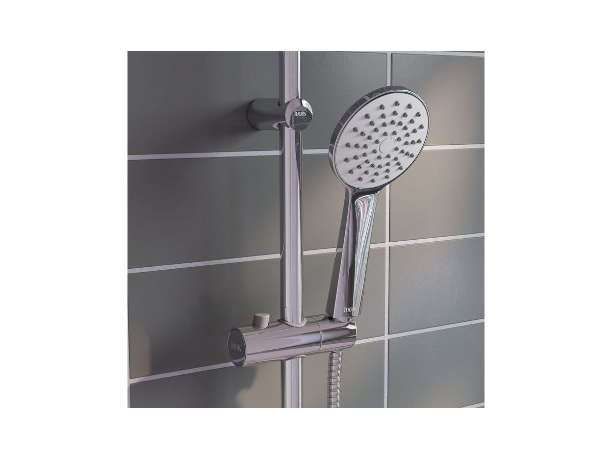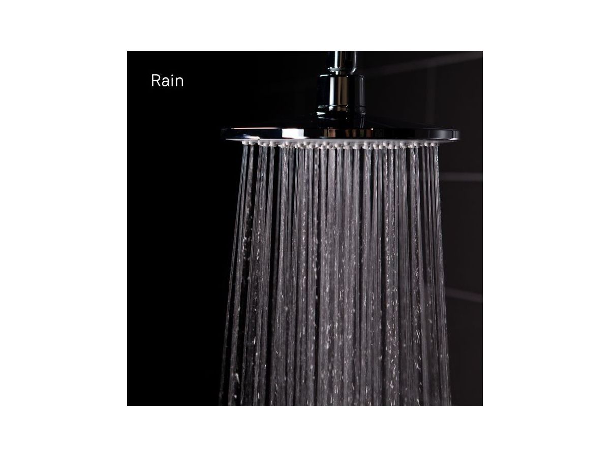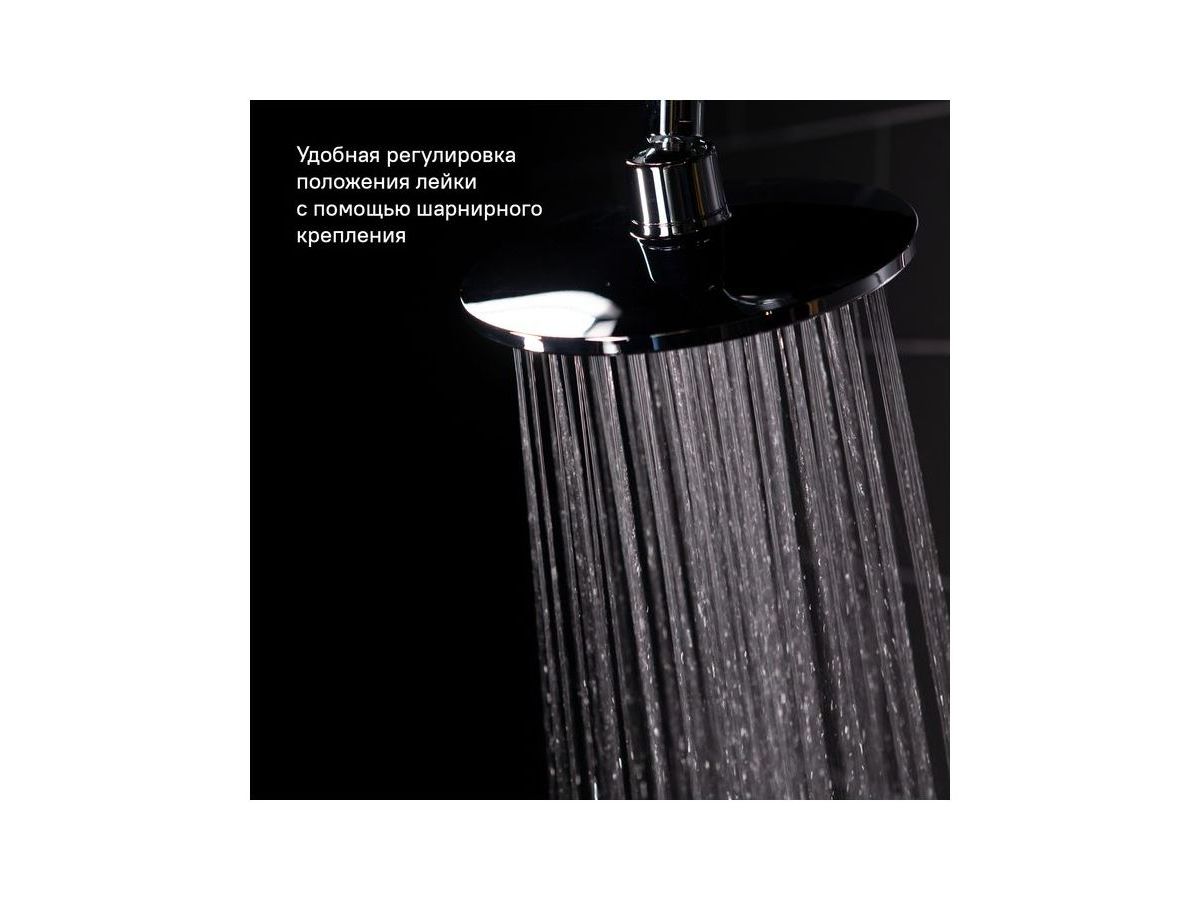 Душевой гарнитур с верхней лейкой. Стойка из нержавеющей стали, диаметр трубы 22 мм, высота 941 мм, верхнее крепление свободное. Ручная лейка с 1 режимом, диаметр 105 мм, верхняя лейка с 1 режимом, диаметр 180 мм, два шланга ПВХ в оплетке из нержавеющей стали: 1,5 м и 0,6 метра, с системами Twist Free и Double Lock. Кнопочный дивертор. В комплекте: крепеж.