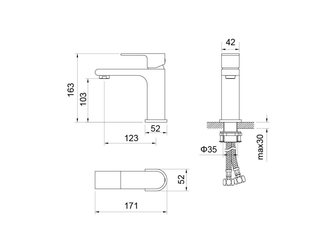 В комплекте: смеситель; гибкая подводка 60см; монтажный комплект