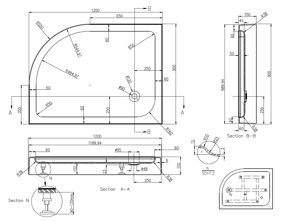 Поддон душевой, полукруглый, акриловый (3,5-4 мм толщ.), каркас с ножками, сифон