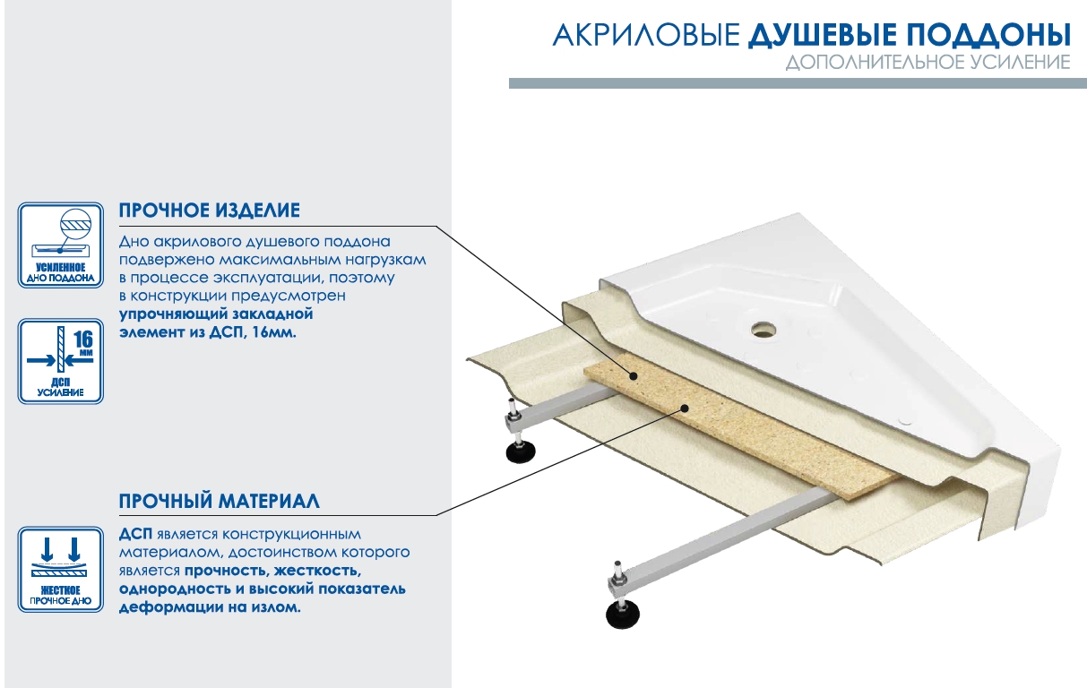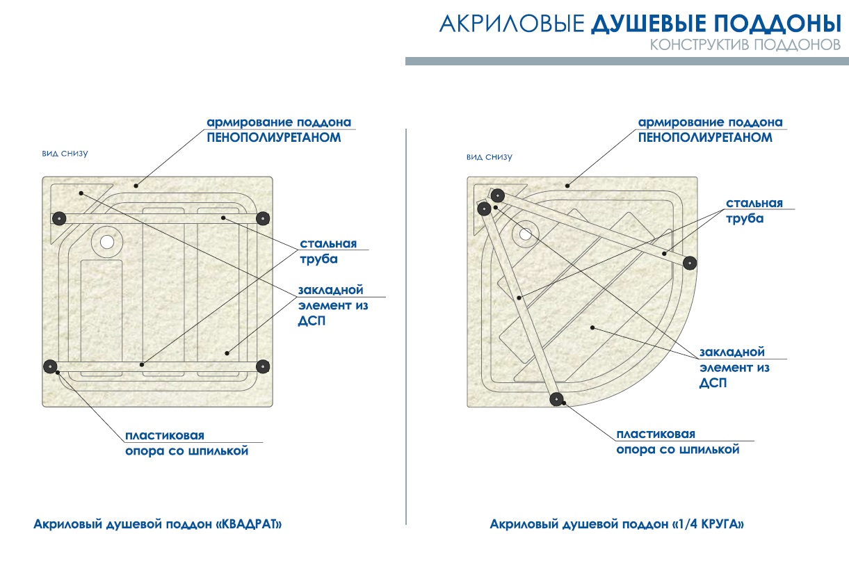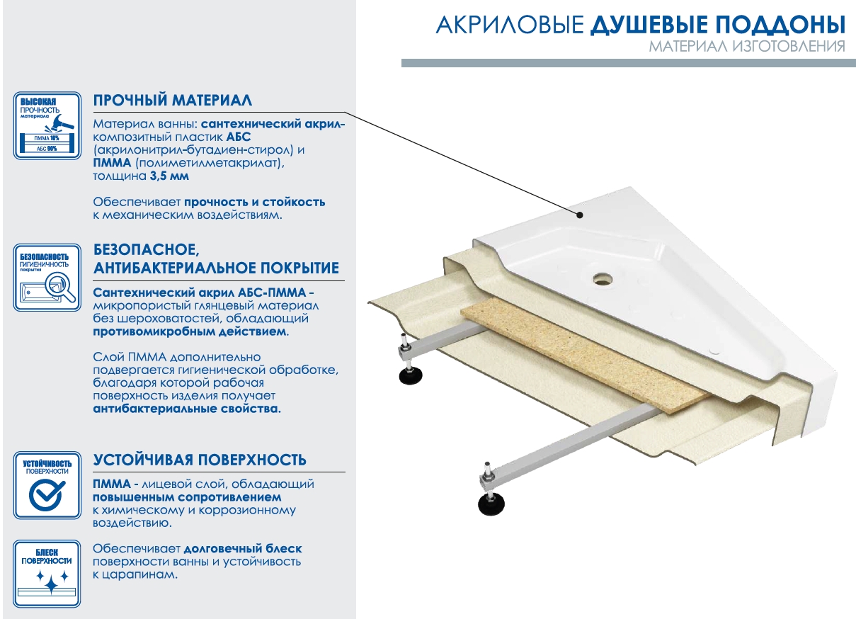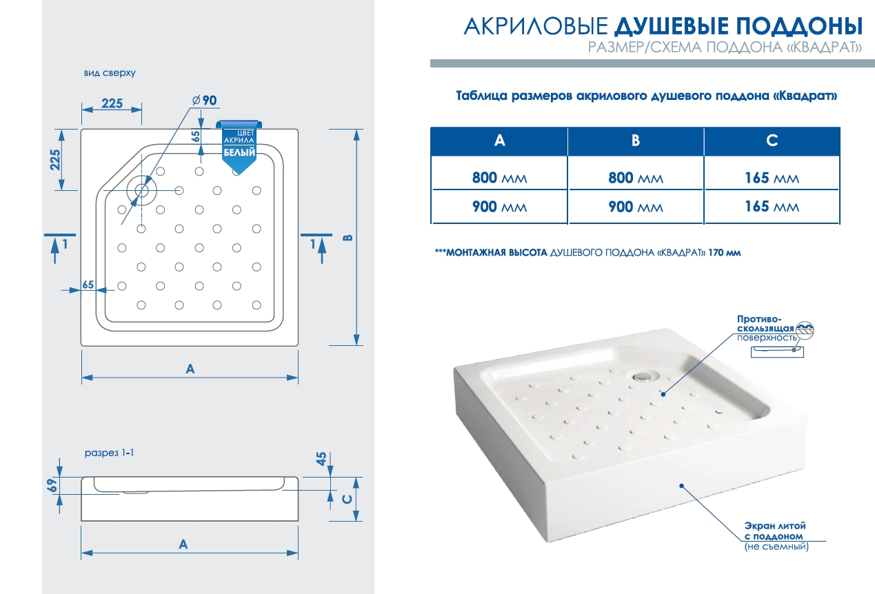 Акриловый душевой поддон "Квадрат" изготовлен из сантехнического акрила АБС(акрилонитрил-бутадиен-стирол) + ПММА (полиметилметакрилат), толщина 3,5 мм, методом вакуумного формования, противоскользяща поверхность, экран литой с поддоном (не съемный)