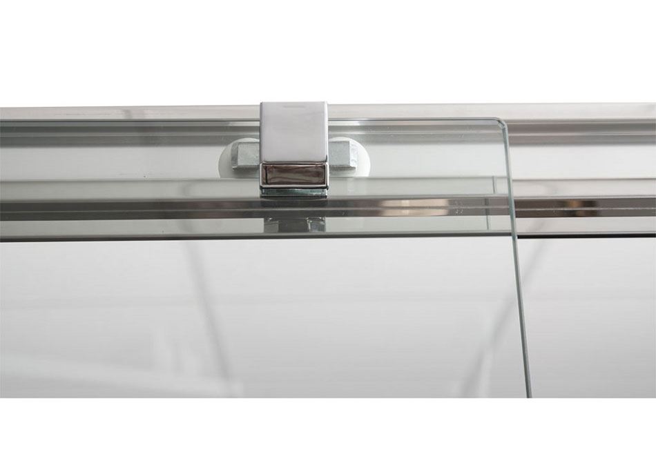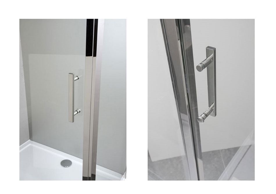 Стеклянная душевая дверка свободно и бесшумно передвигается от центра в сторону стены на двойном усиленном ролике с металлическим подшипником — достаточно лишь легкого касания элегантной ручки с сияющей хромированной отделкой.