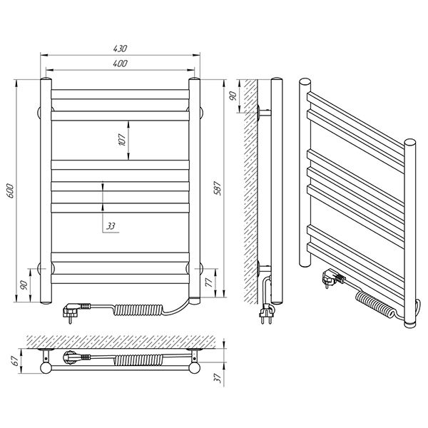 Полотенцесушитель - 1 шт, крепление (шуруп оцинкованный с дюбелем, пятак, втулка, штифт, стойка) - 4 шт, ключ шестигранный - 1 шт, упаковка (короб картонный, чехол полиэтиленовый, чехол полиэтиленовый для крепления, коробочка для креплений) - 1 шт, паспорт - 1 шт.