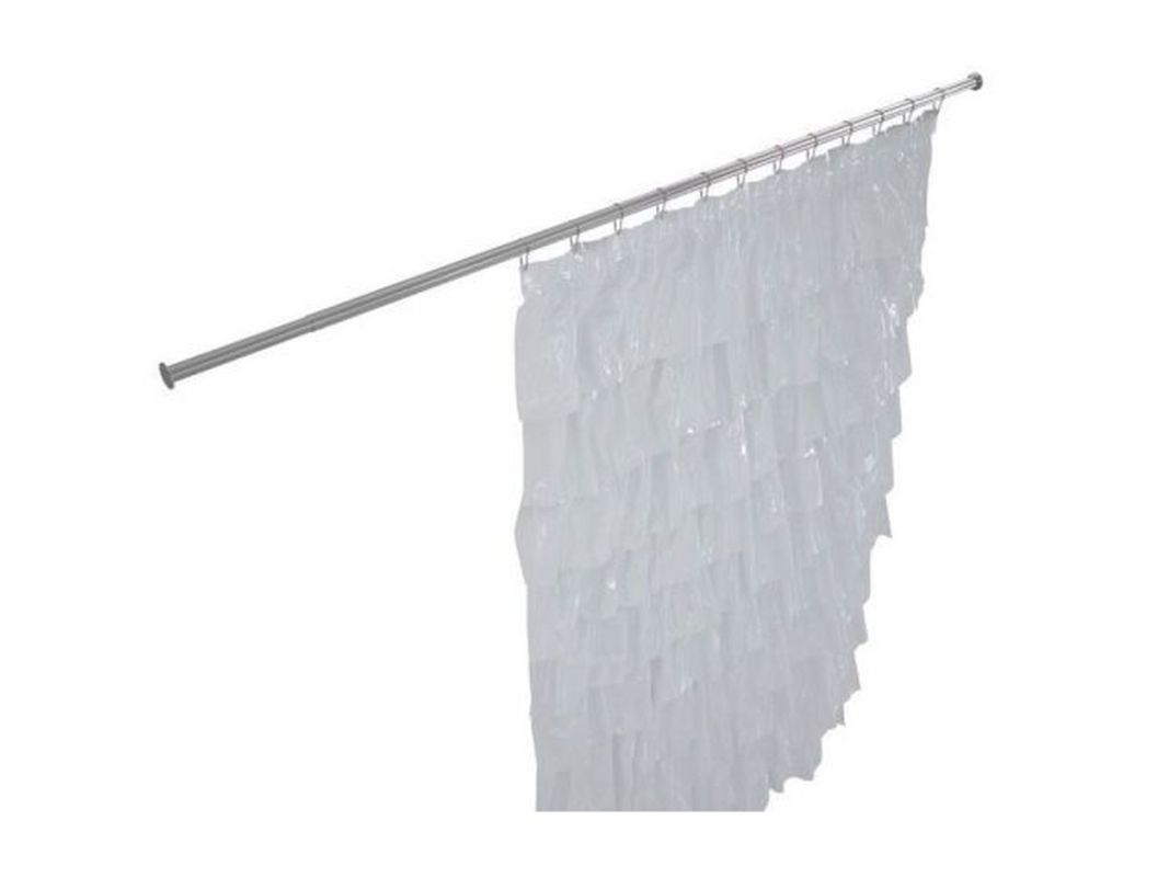 Предназначен для прямоугольных ванн. В отличие от телескопических карнизов он надёжно крепится к стенам и не падает, даже если вы повисните на шторе, штора порвётся раньше.