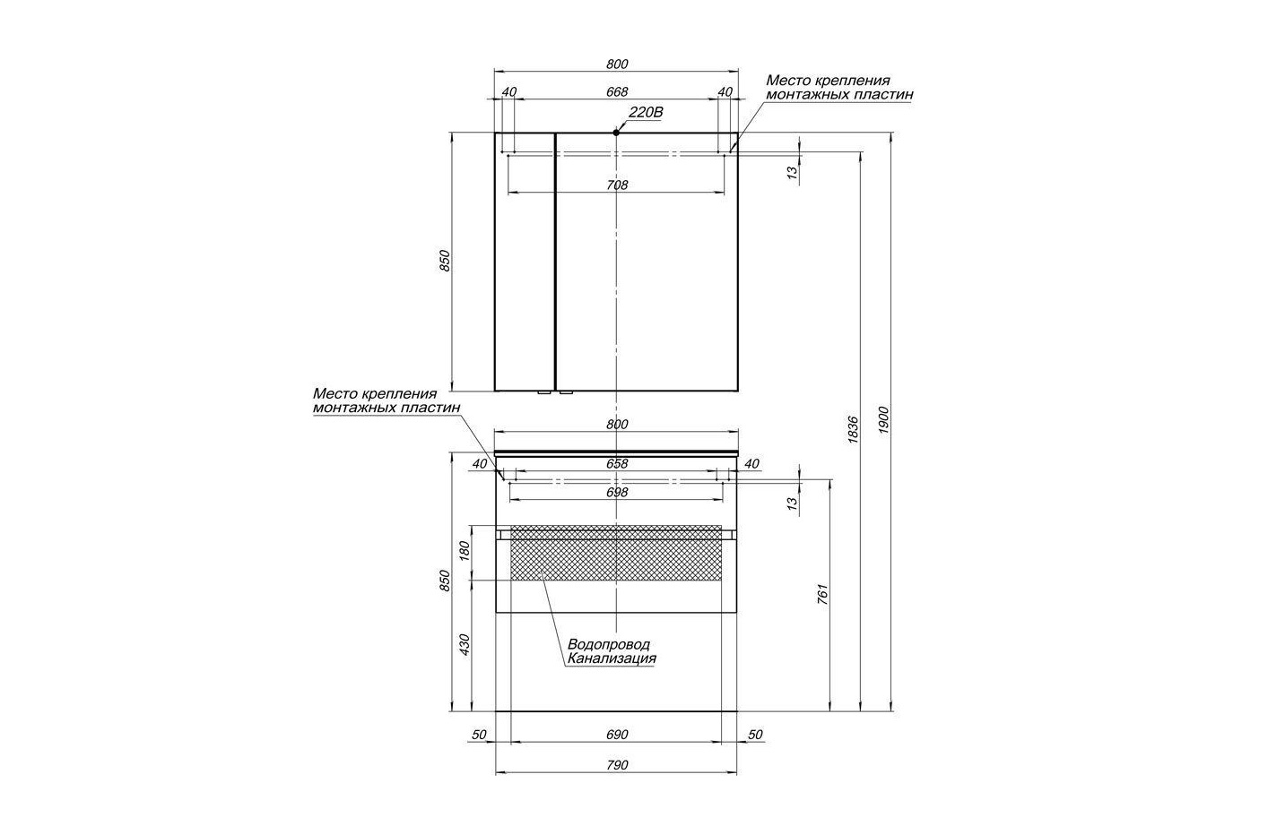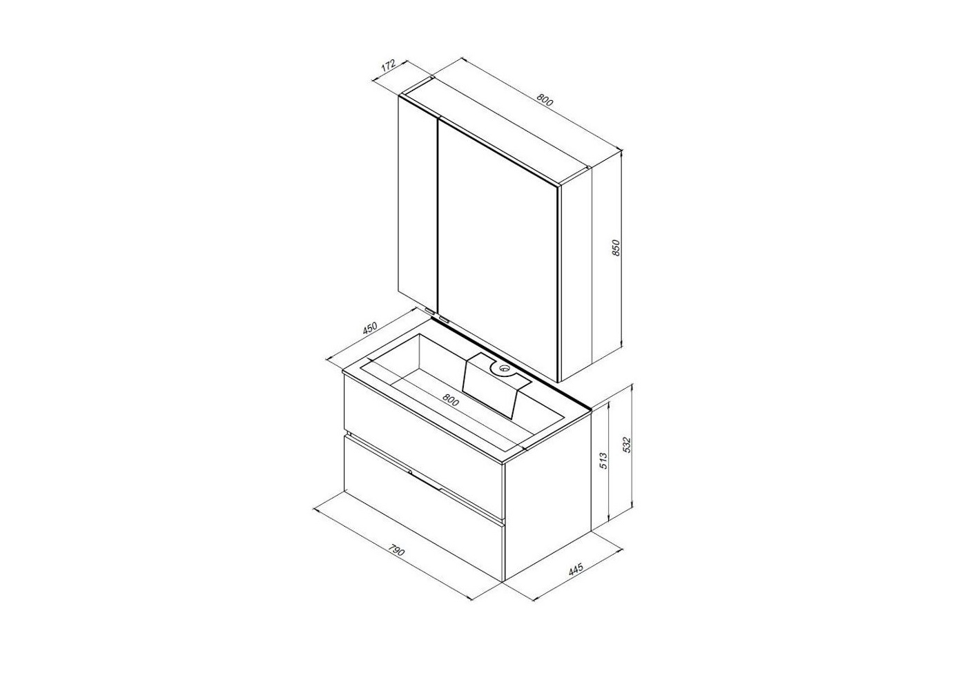 Современный дизайн демонстрирует аккуратный минимализм геометрически четких форм, где основная идея подчинена максимальной функциональности. Вместительная тумба с верхним и нижним выдвижными ящиками и зеркало-шкафчик с полками за распашной дверцей создают дополнительное пространство, где будут надежно скрыты от влаги банные принадлежности, а все необходимое при умывании и принятии ванны теперь будет у вас под рукой.
