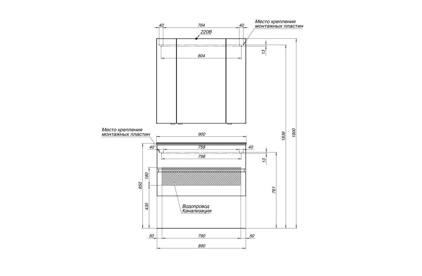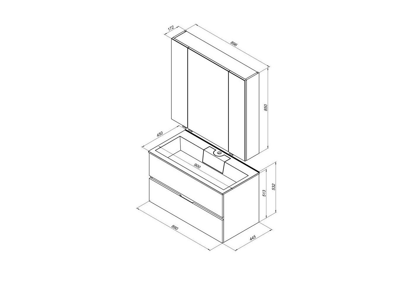 Современный дизайн демонстрирует аккуратный минимализм геометрически четких форм, где основная идея подчинена максимальной функциональности. Вместительная тумба с верхним и нижним выдвижными ящиками и зеркало-шкафчик с полками за распашной дверцей создают дополнительное пространство, где будут надежно скрыты от влаги банные принадлежности, а все необходимое при умывании и принятии ванны теперь будет у вас под рукой.