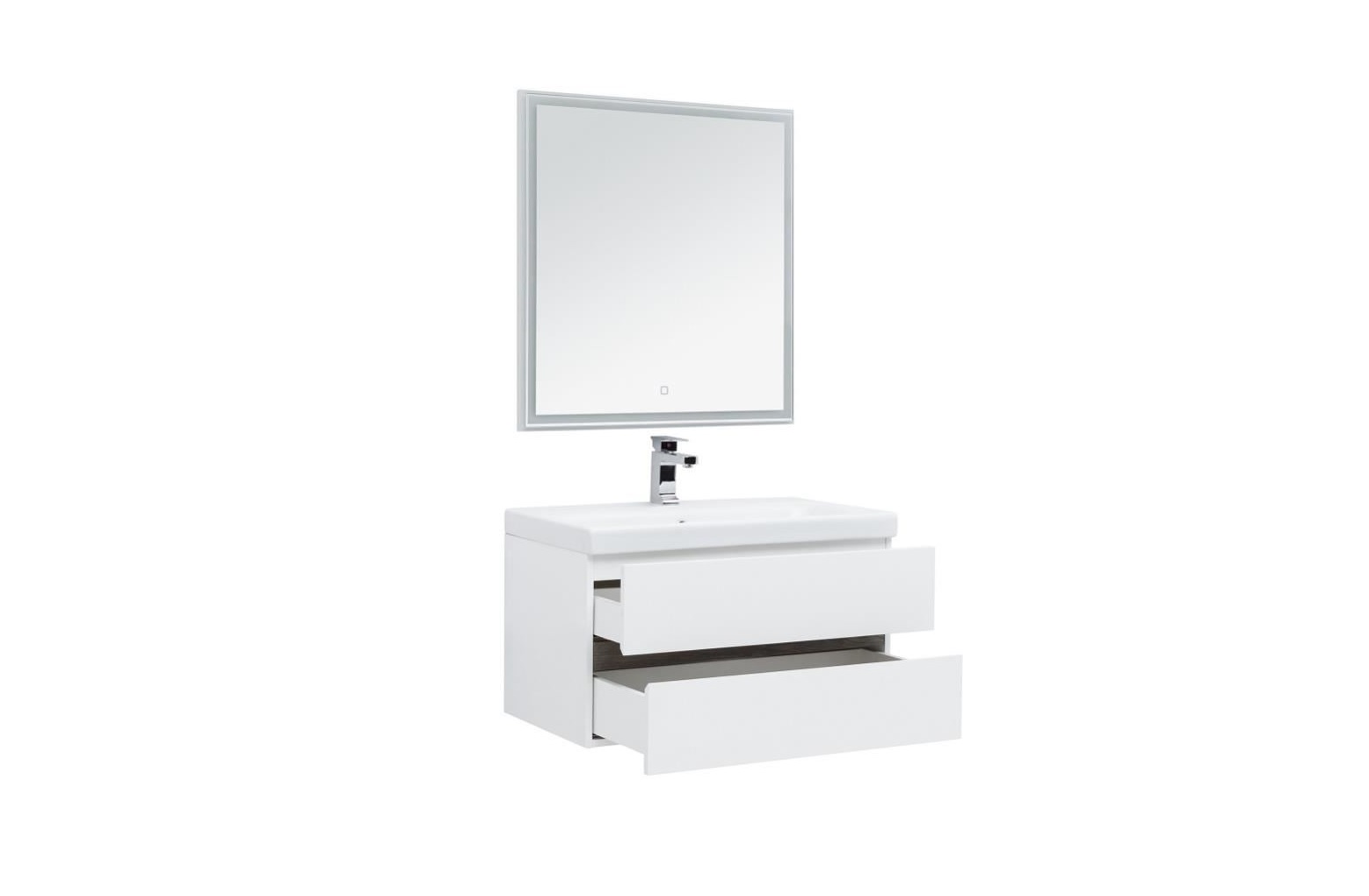 Мебель для ванной Aquanet Беркли 80 белый/дуб рошелье (зеркало белое) имеет изюминку - контрастную декоративную полосу между ящиками в цвете «дуб рошелье». Корпус и фасады тумбы выполнены из влагостойкого ЛДСП и покрыты глянцевой белой эмалью. В конструкции тумбы использованы интегрированные ручки без острых краев и внутренних углов.