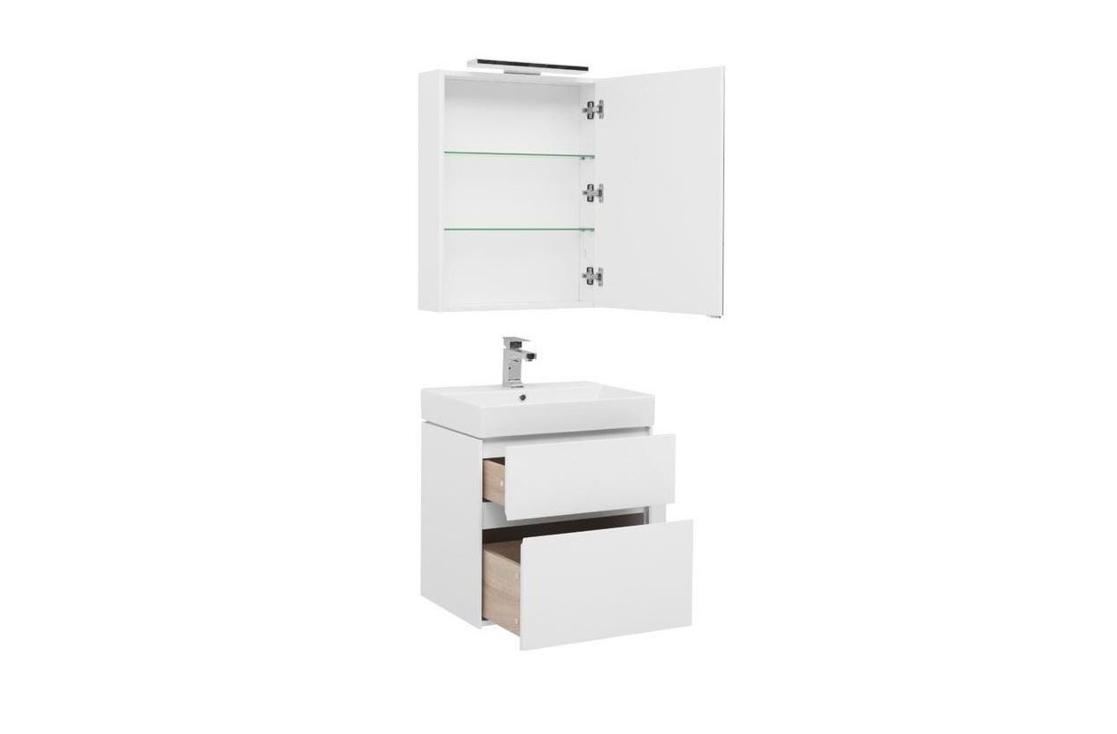 Комплект мебели для ванной Aquanet Бруклин 60 состоит из подвесной тумбы с раковиной и зеркального шкафа - все белого цвета В комплекте соединились модели из разных коллекций: тумба "Бруклин" шириной 60 см и зеркальный шкаф "Латина" шириной 60 см Корпус изделия выполнен из выкрашенного белой краской влагостойкого ЛДСП, фасады – из МДФ