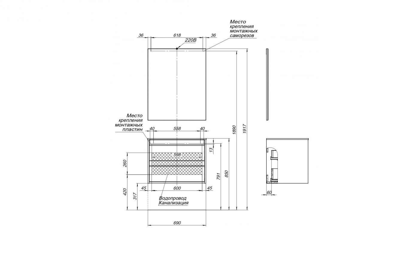 Корпус и фасады тумбы шириной 60 см – из влагостойкого ЛДСП. Сверху установлена раковина «Электра» из литьевого мрамора. У нее максимально глубокая и объемная чаша, но все внутренние детали скруглены.