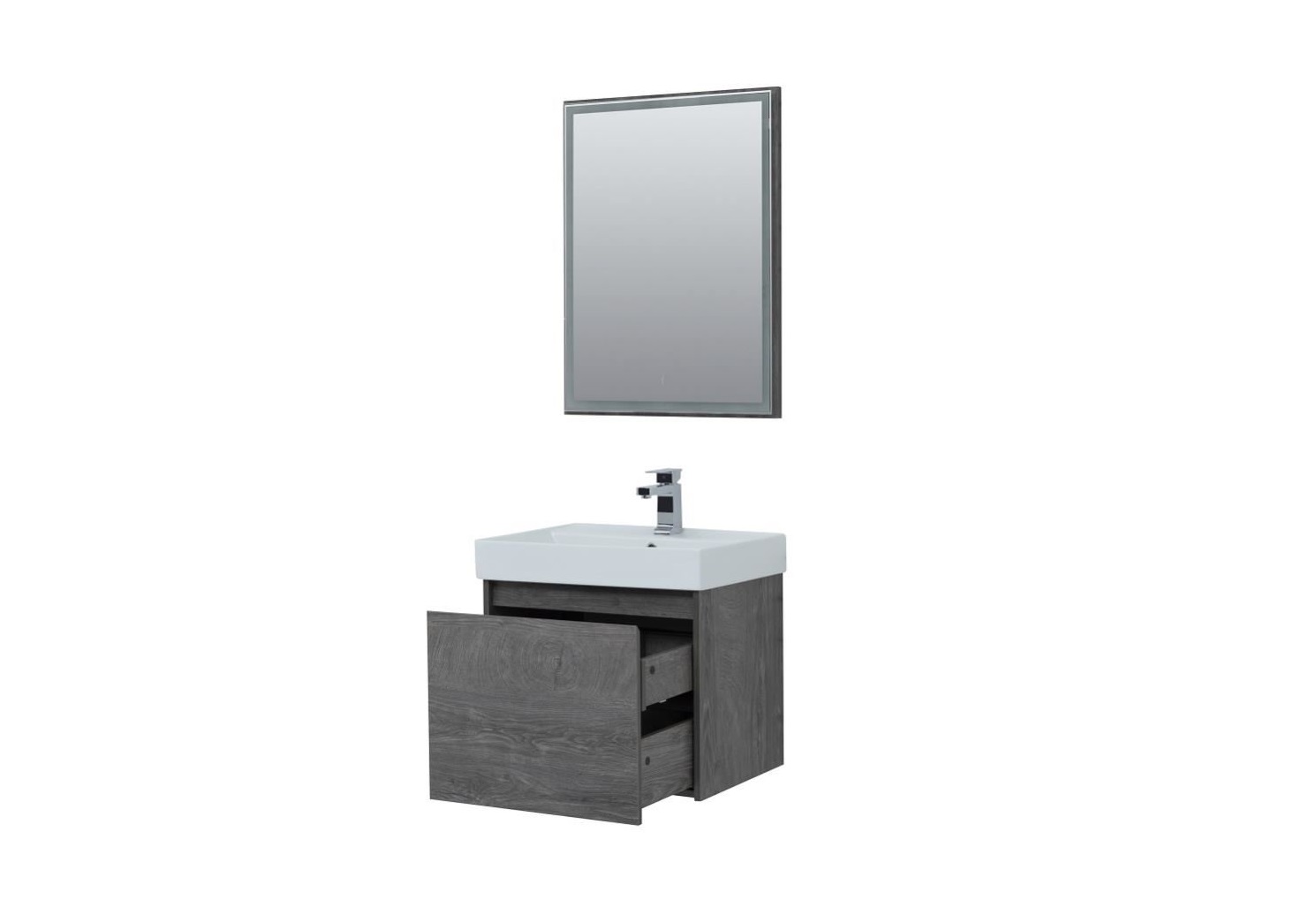 Фактура натурального дерева выглядит изысканно, а подвесной монтаж придает визуальную легкость тумбе шириной 60 см. Тумба оборудована одним большим ящиком, внутри которого предусмотрен маленький с выемкой для установки сифона и разделителями, где удобно хранить необходимые в ванной комнате мелочи.