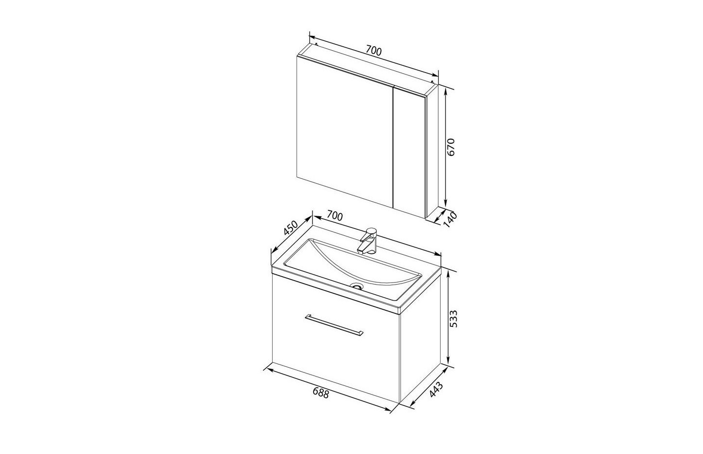 Тумба оборудована керамической раковиной с узкими элегантными бортиками и живописной формой чаши, соединяющей в себе покатые поверхности и четкие рельефные линии. Зеркало по сути своей является фасадной частью вместительного навесного шкафчика с двумя распашными дверцами, куда можно спрятать от посторонних взглядов все предметы ежедневной гигиены. Для удобства использования такого зеркала в верхней его части можно установить LED-светильник, который заказывается дополнительно и представлен в широком ассортименте на выбор.