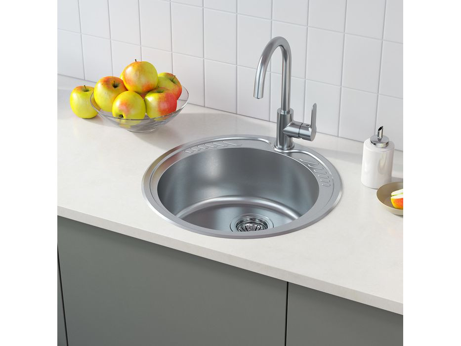 Коллекцию кухонных моек Suno отличают округлые очертания чаши, что обеспечивает высокую эргономичность использования кухонного пространства и эстетичность интерьера. Стальная мойка с шелковистой поверхностью диаметром 490 мм украшена лаконичным, но стильным узором. Благодаря своей форме изделие прекрасно подойдет для небольших кухонь (с гарнитурами и тумбами от 45 см), где на счету каждый сантиметр рабочей поверхности. Мойка Suno полностью готова к установке, все необходимое для монтажа поставляется в комплекте: крепеж, шаблон для выреза столешницы и эластичная уплотнительная лента.