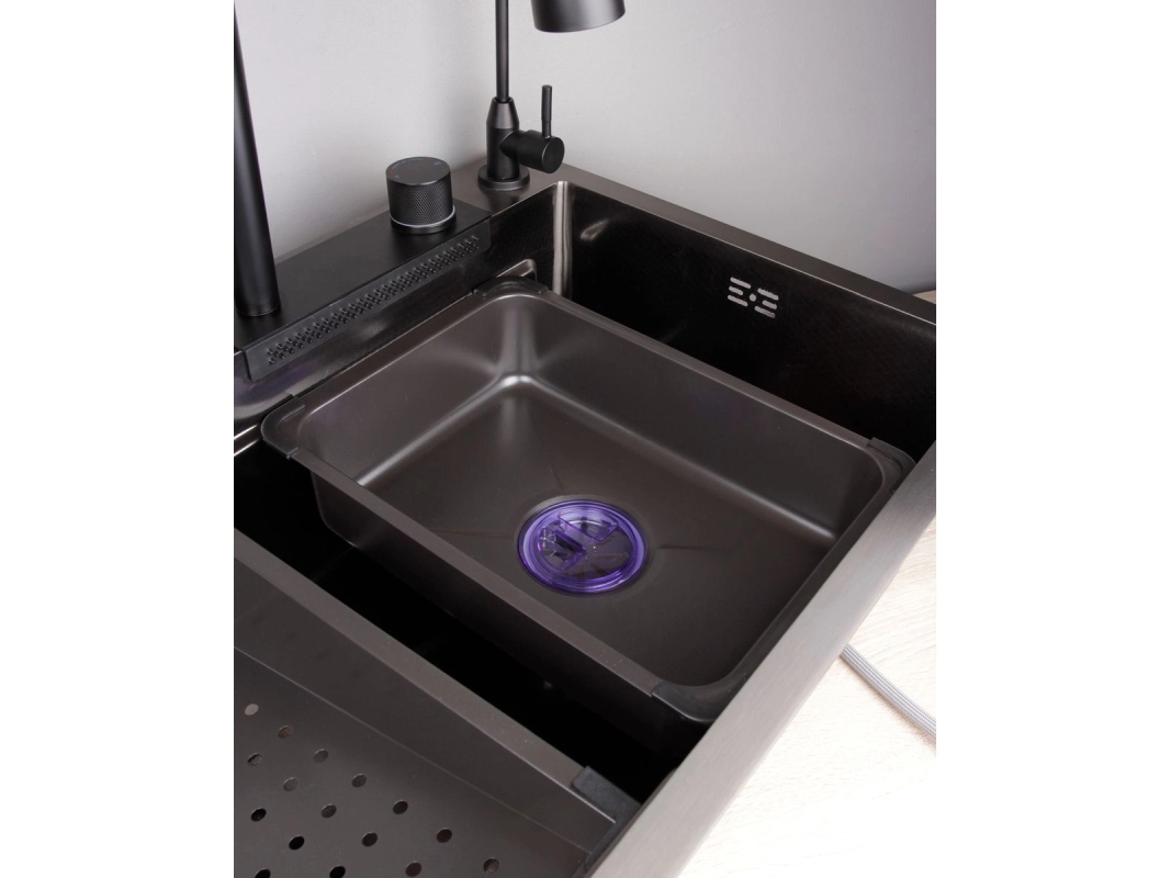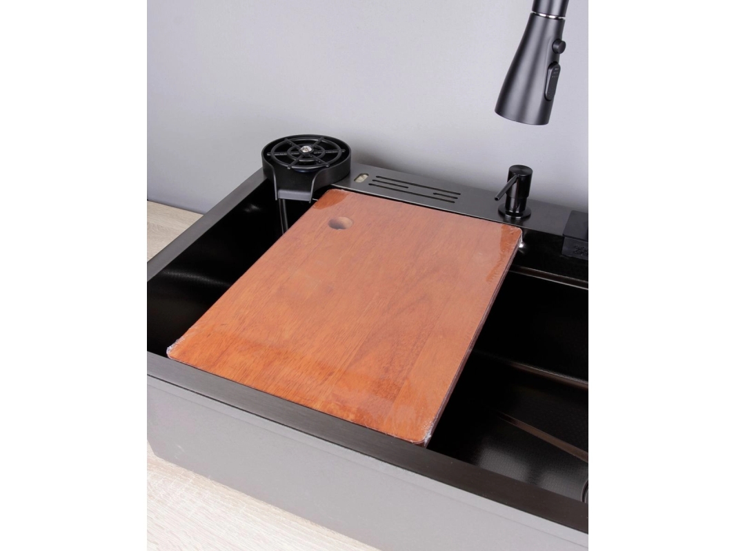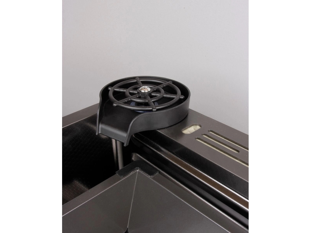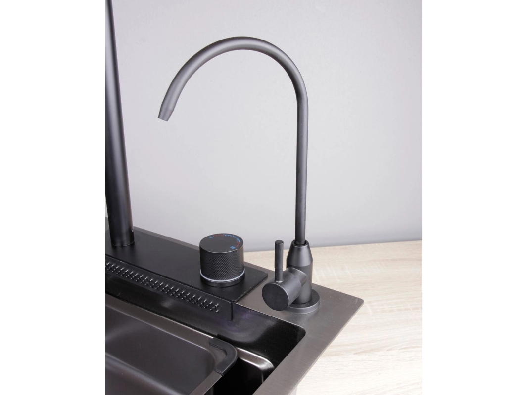Комплектация: мойка, смеситель с вытяжным изливом, смеситель для питьевой воды, сливная арматура, дозатор для мыла, разделочная доска, ринзер для стаканов, чаша для хранения, держатель для ножей.