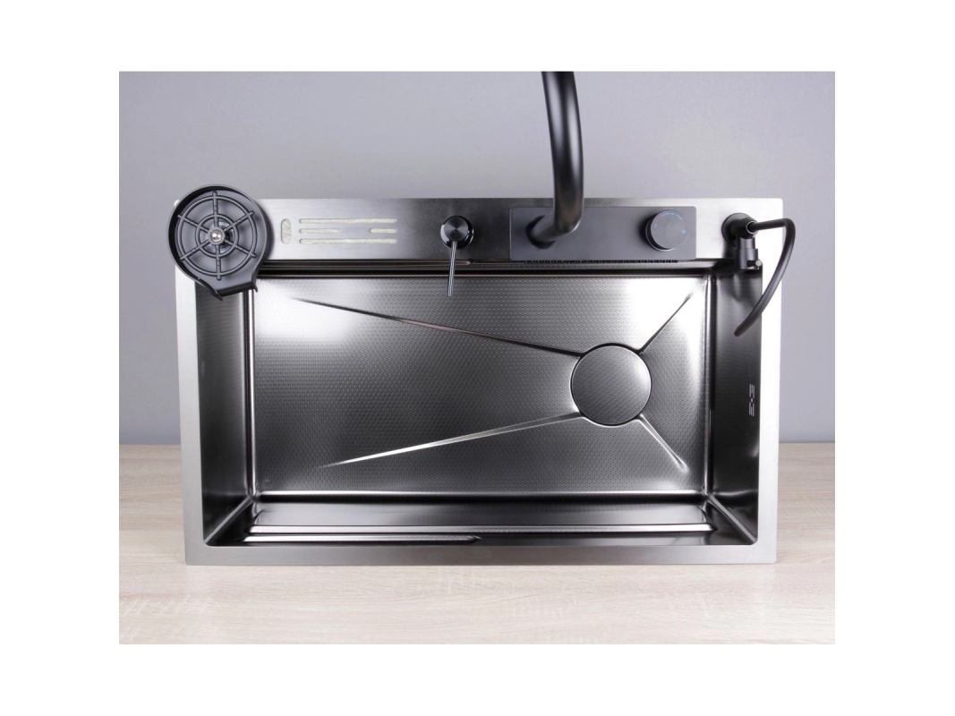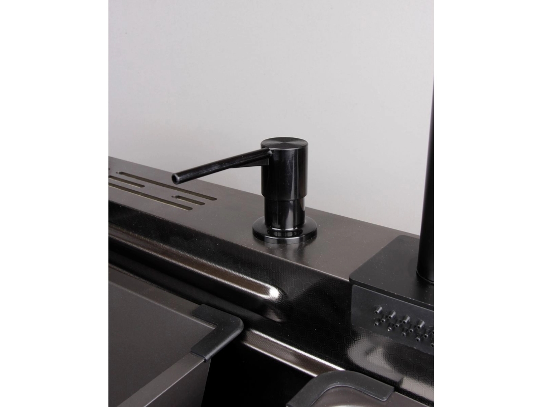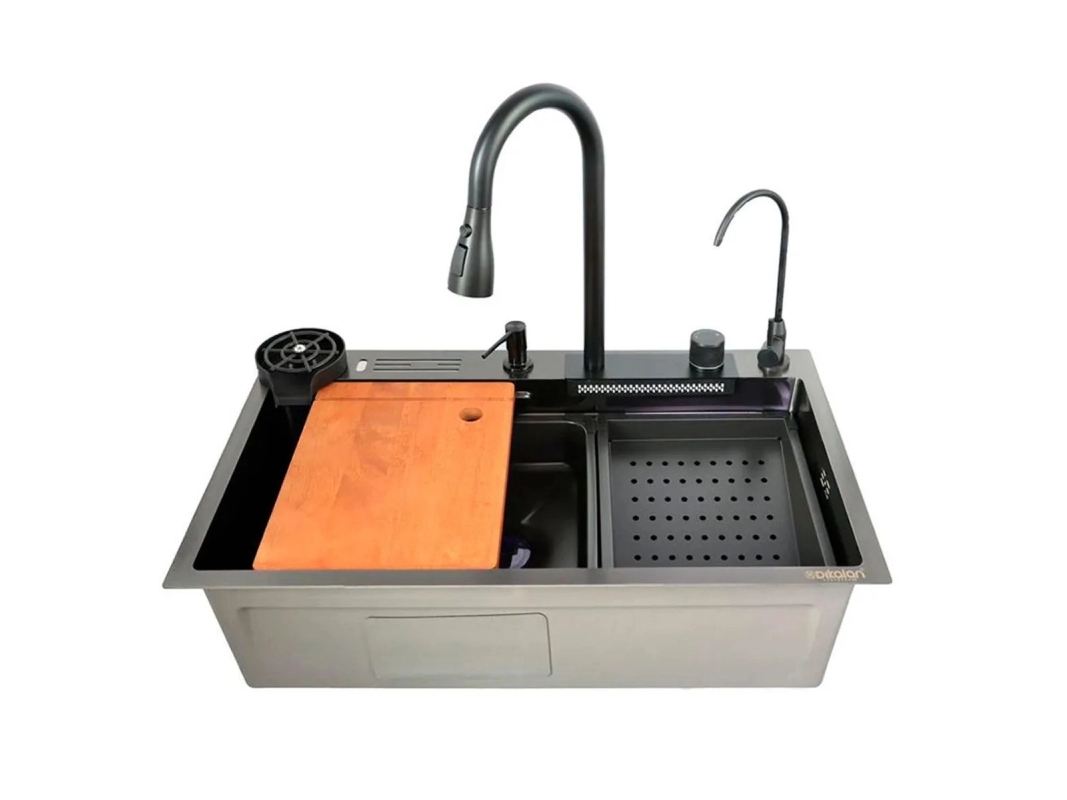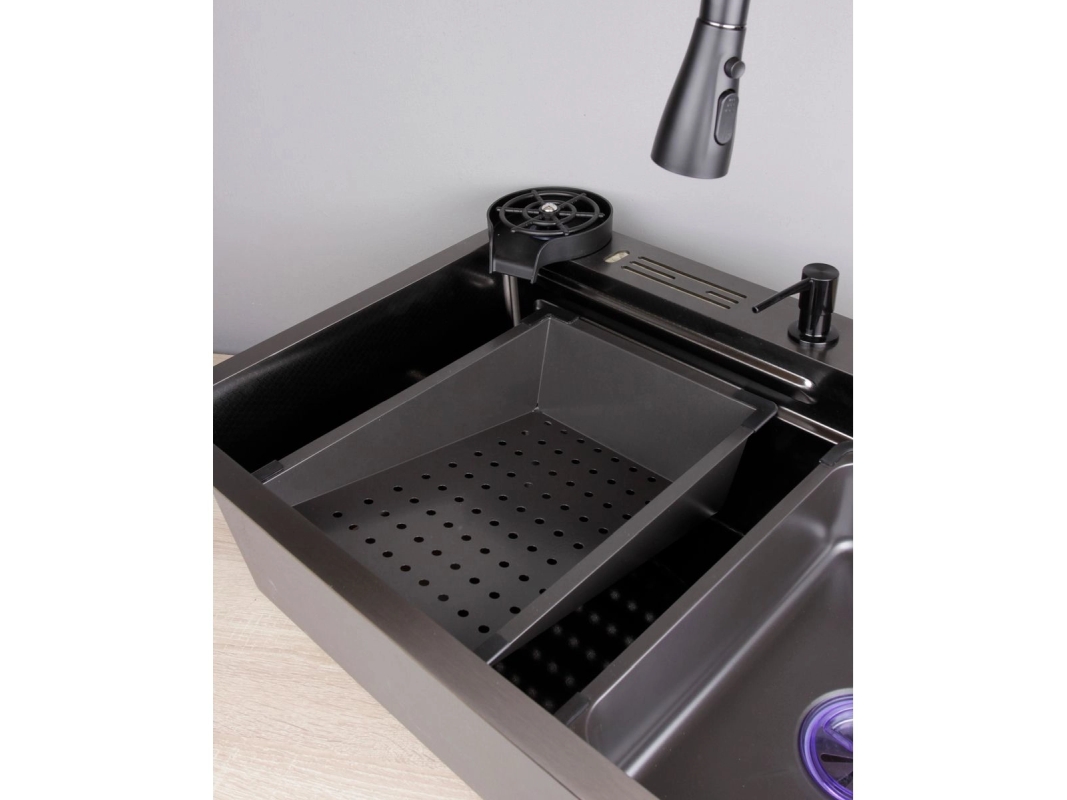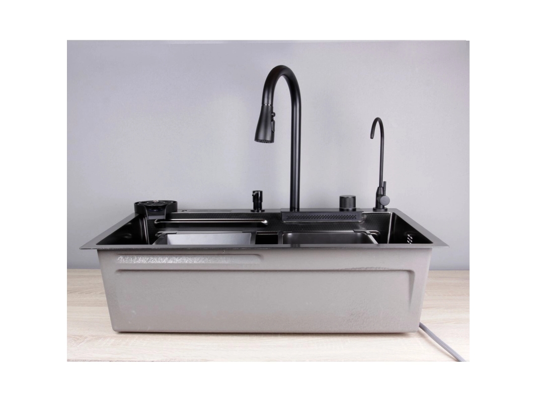 Комплектация: мойка, смеситель с вытяжным изливом, смеситель для питьевой воды, сливная арматура, дозатор для мыла, разделочная доска, ринзер для стаканов, чаша для хранения, держатель для ножей.