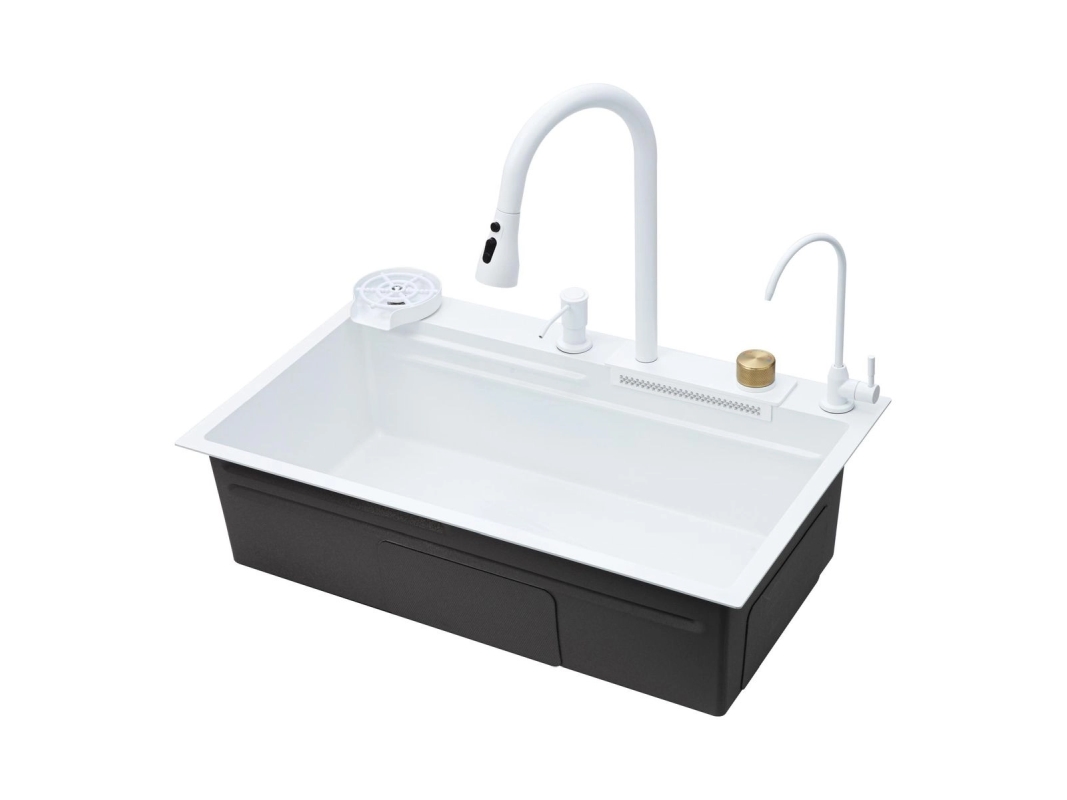 боковой отвод воды позволяет разместить больше кухонных принадлежностей