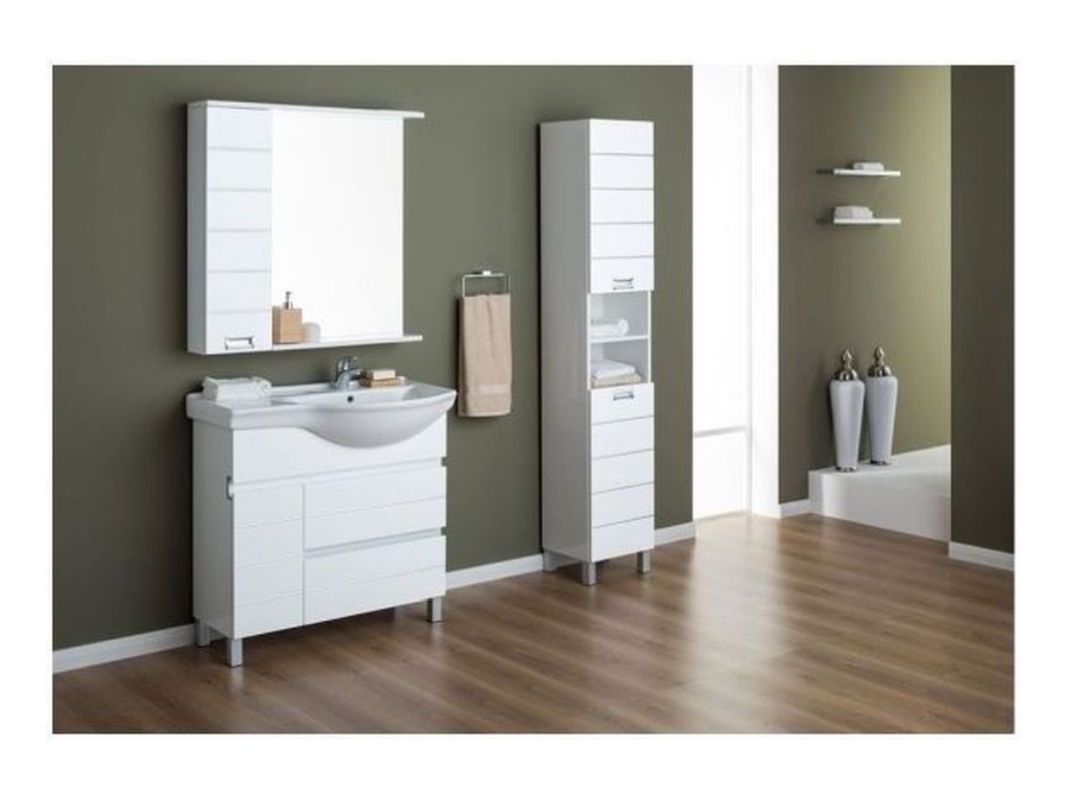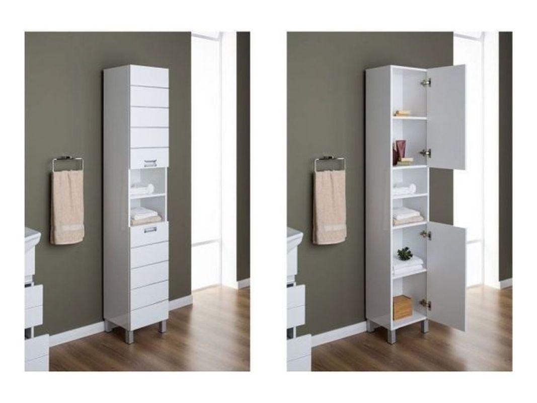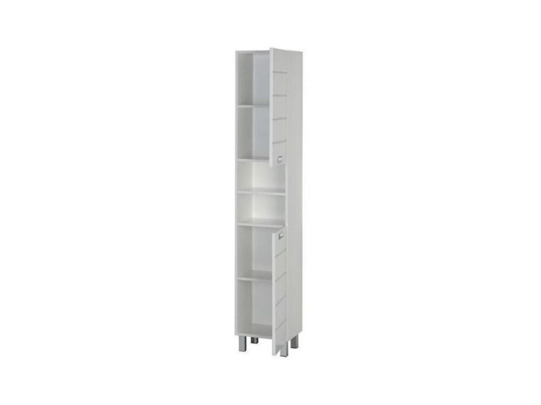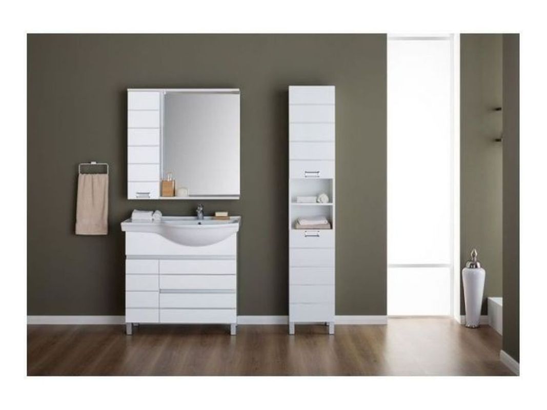Стильный пенал для набора мебели ванной комнаты в стиле «модерн». Оригинальные детали – ручки-прорези и ритм, создаваемый горизонтальными линиями отделки подчеркивают неординарность, экзотичность гарнитура. Функциональная часть представлена двумя вместительными отделениями с распашными дверцами и открытыми полочками, где можно расставить интерьерные аксессуары.