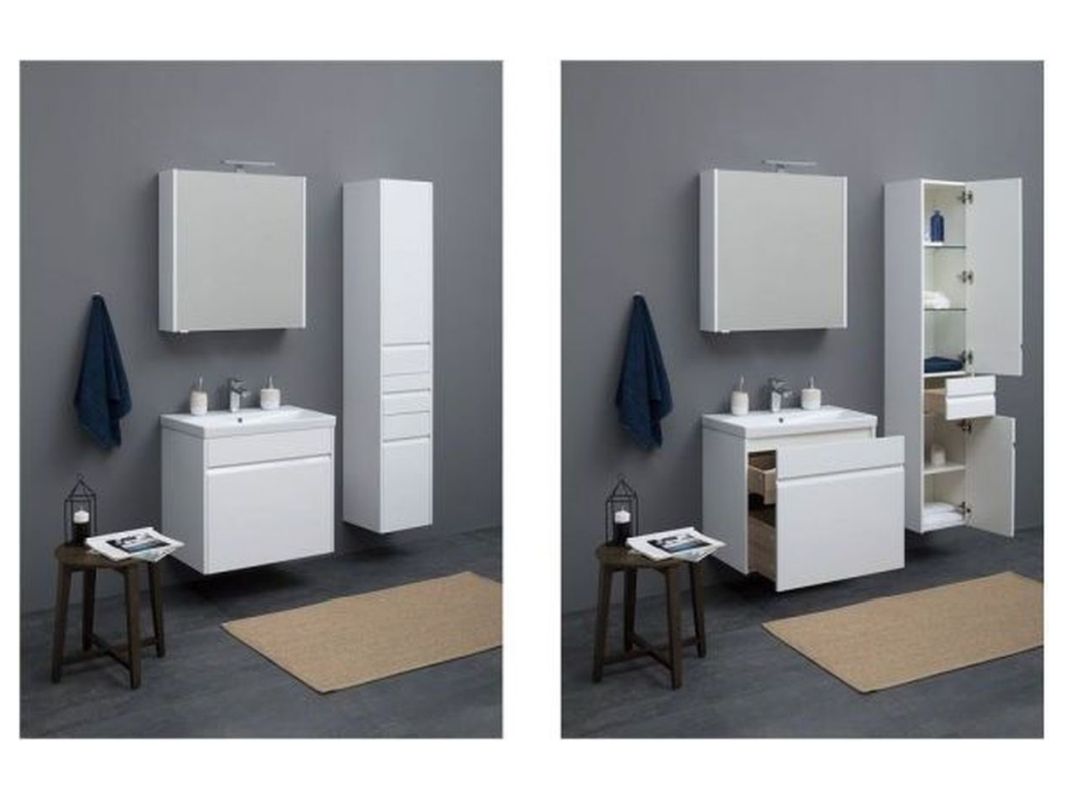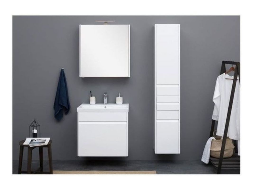 Шкаф-пенал для ванной Aquanet Палермо белого цвета шириной 35 см с корпусом из влагостойкого ЛДСП интересен в первую очередь игрой деталей. Так, полосы глубокой фрезеровки на фасаде - это вовсе не декоративные детали, как может показаться на первый взгляд, а удобные интегрированные ручки - модный мебельный тренд. Пенал разделен на три зоны хранения, соответственно, в нем предусмотрено три таких фрезеровки-ручки. Две из них открывают распашные дверцы, за которыми в общей сложности скрыты пять полок, и одна служит ручкой для расположенного посередине выдвижного ящика. Функционально, просто и красиво. .