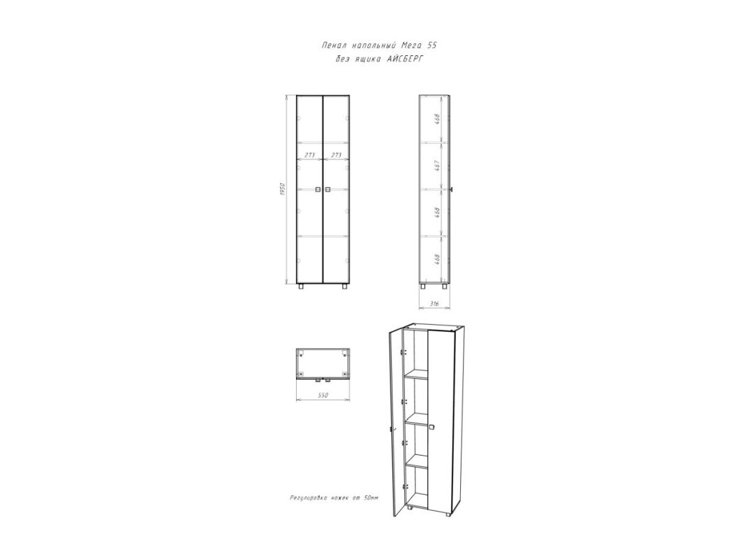 У напольной мебели возможна регулировка ножек до 30 мм, а для удобства в использовании на дверях установлены петли с доводчиком.