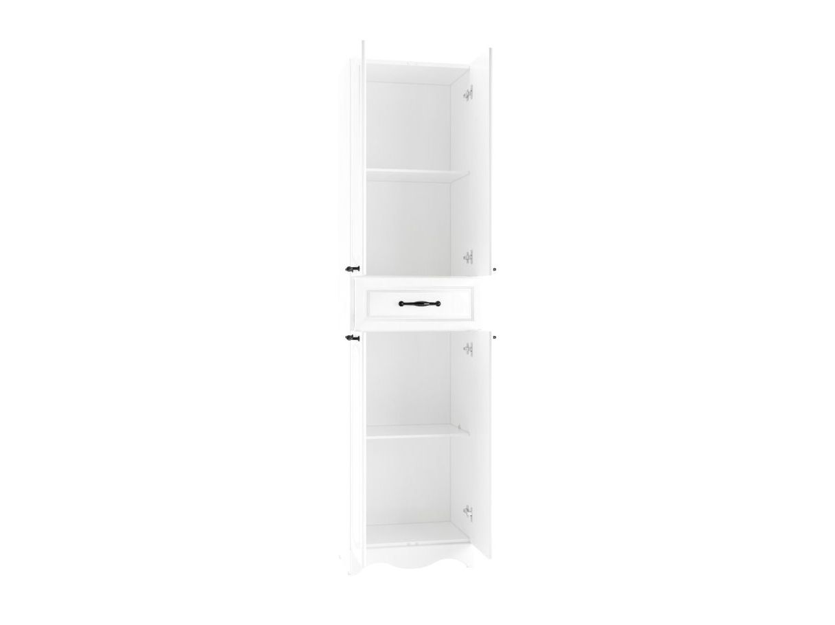 Напольный пенал выполнен также в двух цветах. Имеет один выдвижной ящик и два отсека – над ящиком и под ним, отсеки открываются с помощью дверей и разделены полкой.