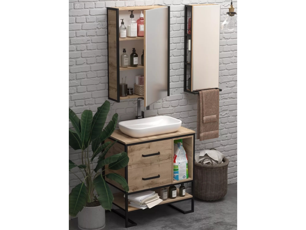 Сквозной пенал в стиле лофт - это эффектное и одновременно практичное решение, в котором сошлись воедино внешняя эстетика и необходимая функциональность. Пенал позволяет с удобством размещать внутри косметику, аксессуары, бытовую химию и личные вещи, а также иметь к ним быстрый доступ не только через дверцу, но и с боковых сторон. При этом металлические кронштейны могут использоваться как рейлинги для дополнительного комфорта. Дизайн пенала отличается лаконичностью и следованием духу минимализма, а благодаря небольшим габаритам он подойдет для ванных комнат любого размера.