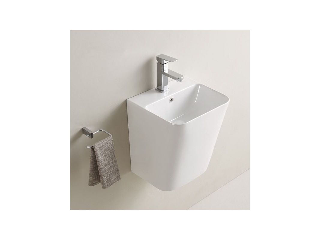 Подвесная раковина моноблок позволяет скрыть подведенные коммуникации.