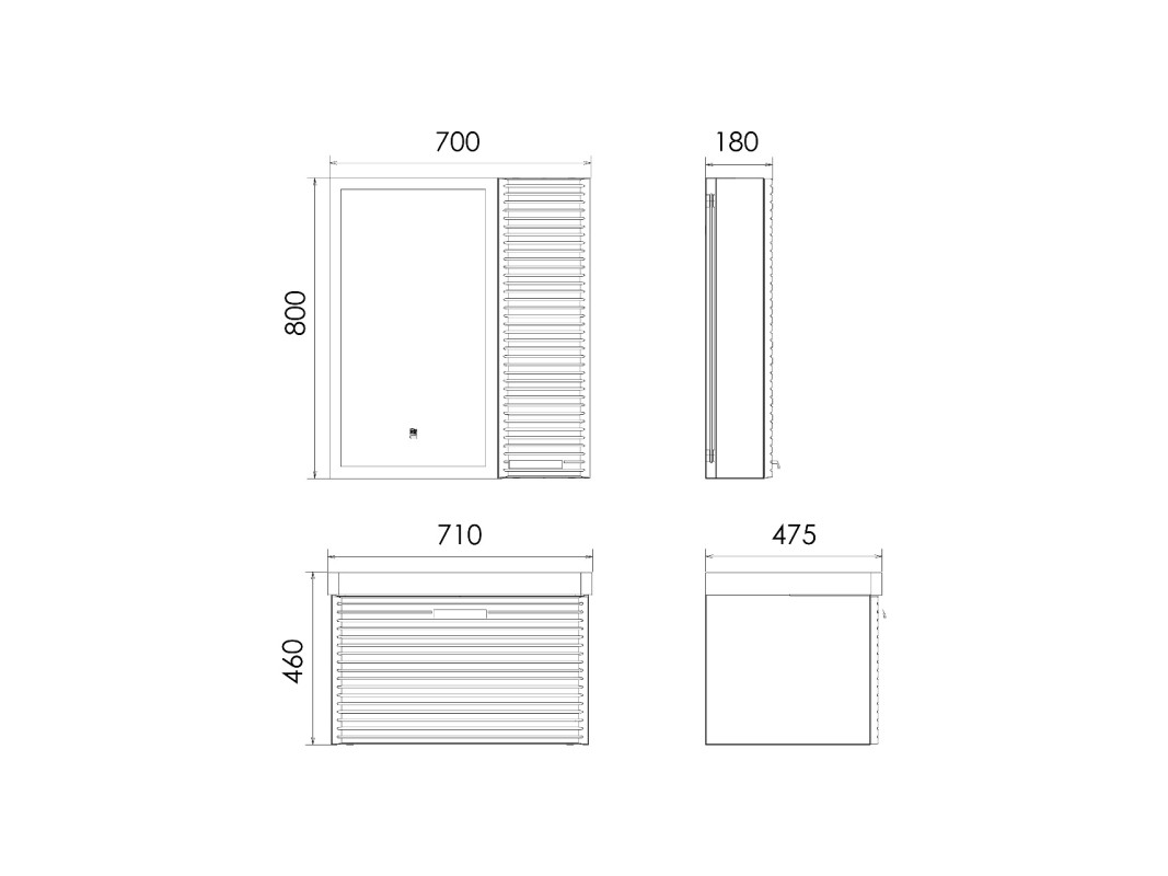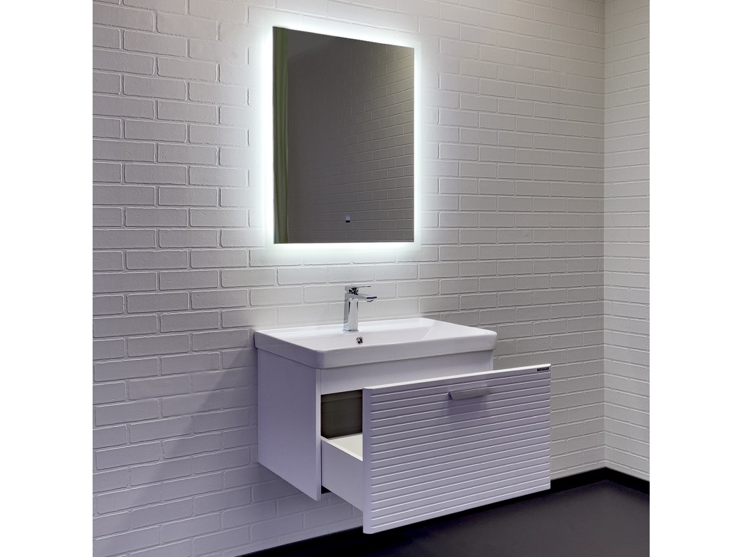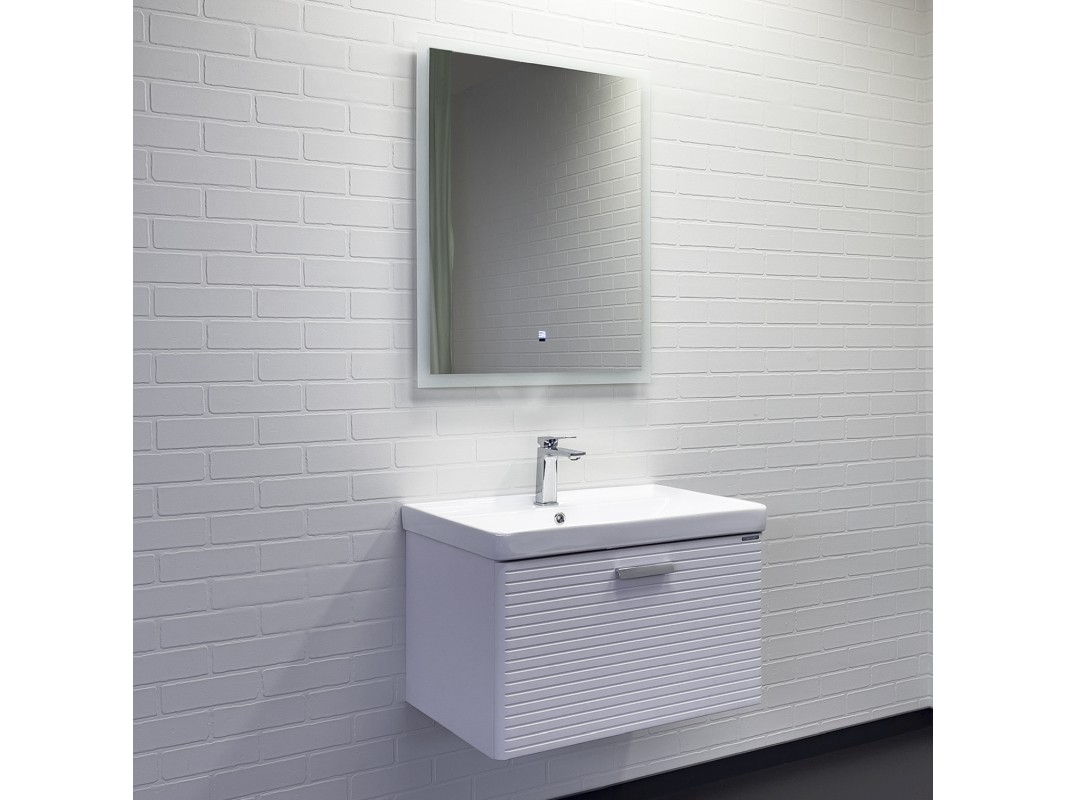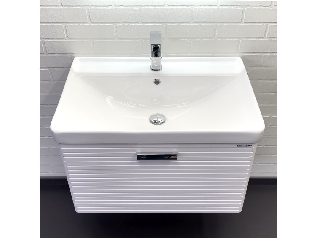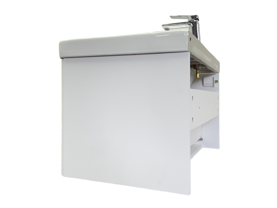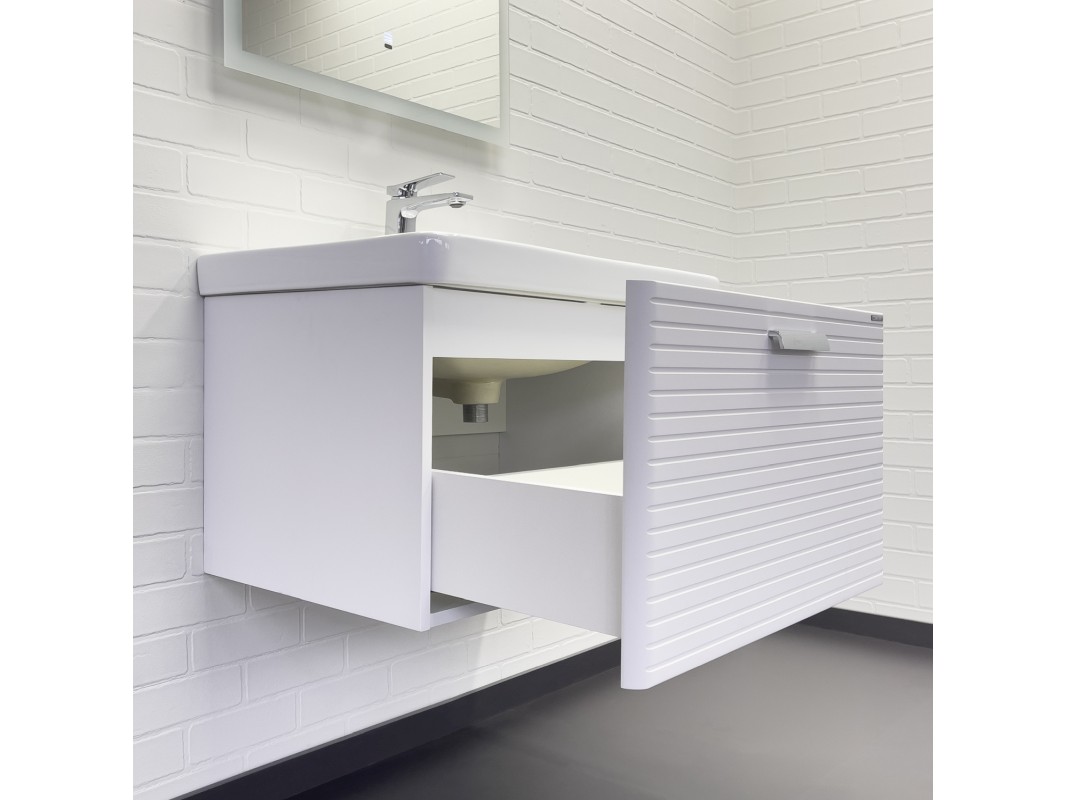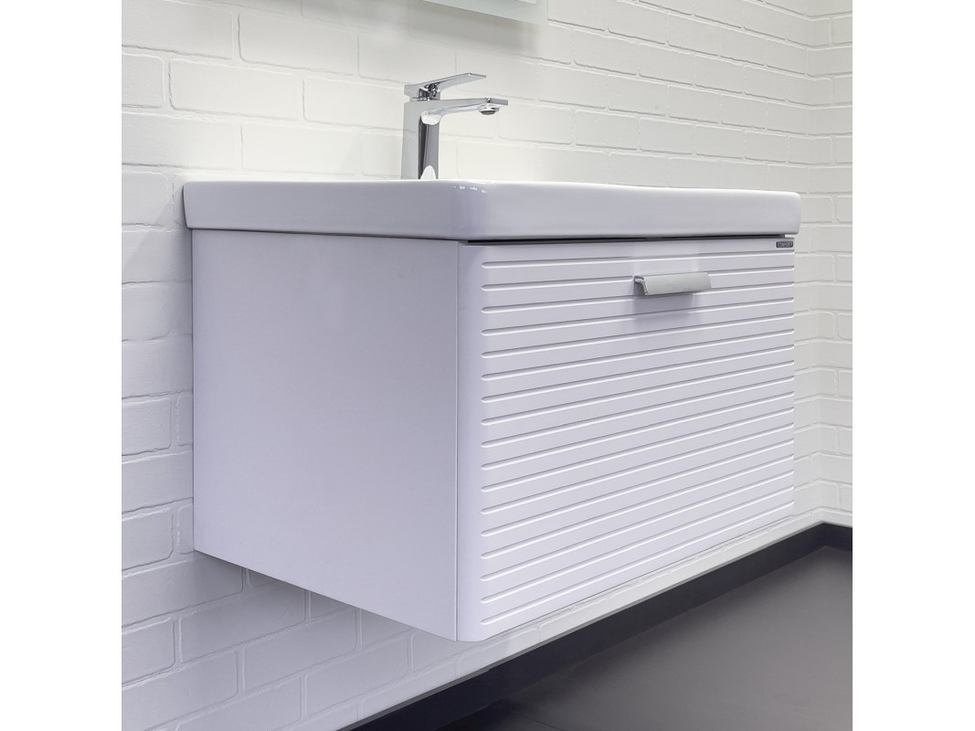 Подвесная тумба с одним большим выдвижным ящиком оснащенным направляющими с системой плавного закрывания. Оригинальные эргономичные ручки цвета хром. Фасады тумбы изготовлены из МДФ, фрезерованы горизонтальным узором и облицованы белой матовой пленкой. Тумба подготовлена для подключения водоснабжения снизу и сзади.