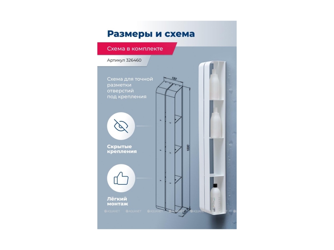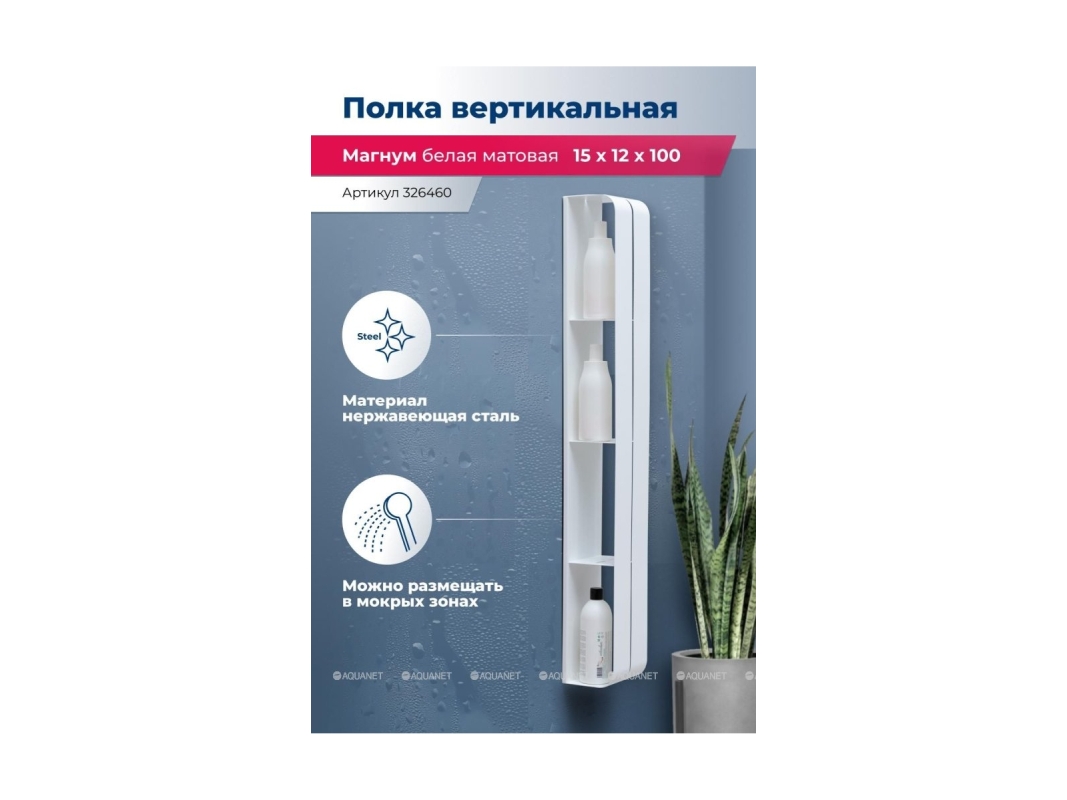 Полка Aquanet Магнум H 15x100 белая матовая, вертикальная - идеальное решение для хранения вещей и аксессуаров в ванной комнате. Она состоит из трех полочек и вертикального каркаса без острых краев и углов. Легкий монтаж полочки для ванной обусловлен идущей в комплекте схемы для точной разметки. Материал настенной полки - нержавеющая сталь толщиной 1,5 мм. Благодаря скрытым креплениям и материалу, полку можно размещать даже в мокрых зонах ванной комнаты без опасений за ее прочность и сохранность.