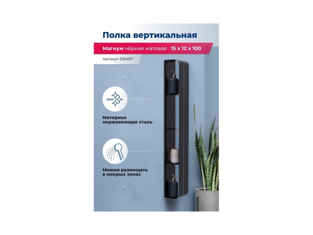 Полка Aquanet Магнум H 15x100 черная матовая, вертикальная - идеальное решение для хранения вещей и аксессуаров в ванной комнате. Она состоит из трех полочек и вертикального каркаса без острых краев и углов. Легкий монтаж полочки для ванной обусловлен идущей в комплекте схемы для точной разметки. Материал настенной полки - нержавеющая сталь толщиной 1,5 мм. Благодаря скрытым креплениям и материалу, полку можно размещать даже в мокрых зонах ванной комнаты без опасений за ее прочность и сохранность.