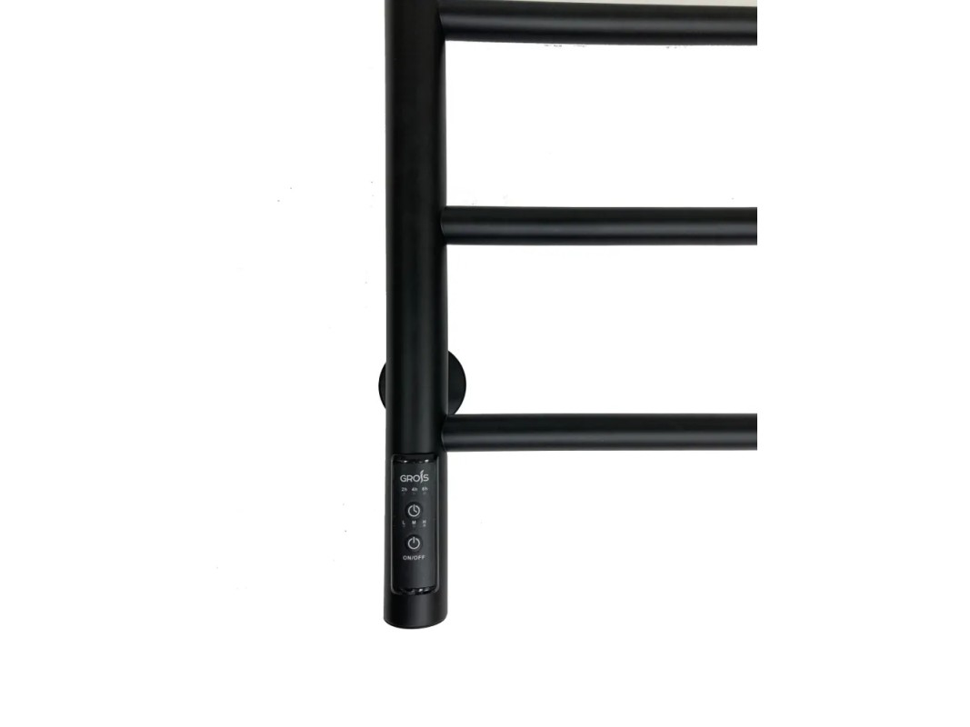 Полотенцесушитель электрический «GROIS» Laura GR-131 400×700 П6 черный матовый подключение слева изготовлен из углеродистой стали с использованием профильных труб круглого сечения. Полотенцесушитель имеет нагревательный элемент кабельного типа (сухой ТЭН). Полотенцесушитель оснащен терморегулятором с возможностью регулировки времени работы и мощности нагрева. Изделие окрашивается порошковой эмалью черного цвета с приятной матовой фактурой, что обеспечивает антикоррозийные свойства и современный внешний вид. Электрический полотенцесушитель Laura имеет высокую степень теплоотдачи, может выступать в роли нагревающего дополнительного элемента в вашей комнате, красивый и стильный дизайн электрического полотенцесушителя будет гармонировать с мебелью вашего пространства, добавлять стилистику ванной комнаты.