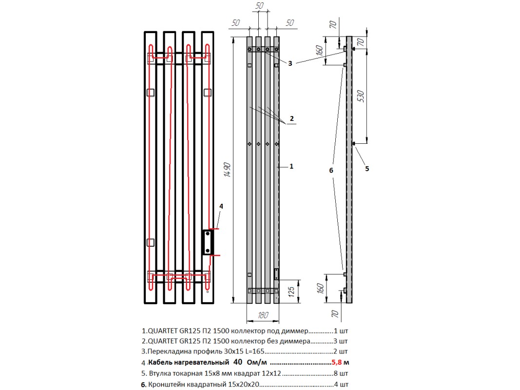 Полотенцесушитель — 1 шт.; модуль скрытого подключения – 1 шт.; кабель для подключения к сети – 1 шт.; крепление к стене — 4 шт.; технический паспорт — 1 шт.