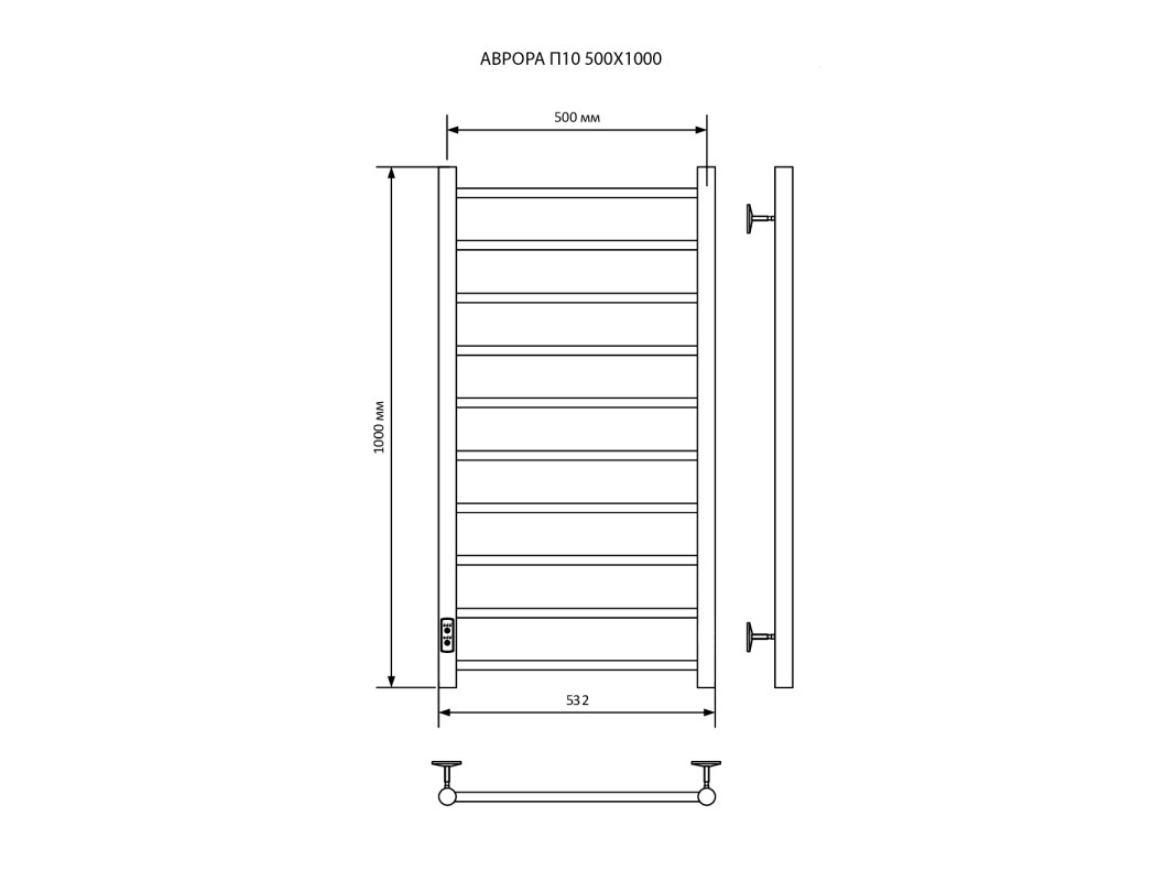 Полотенцесушитель — 1 шт.; модуль скрытого подключения – 1 шт.; кабель для подключения к сети – 1 шт.; крепление к стене — 4 шт.; технический паспорт — 1 шт.
