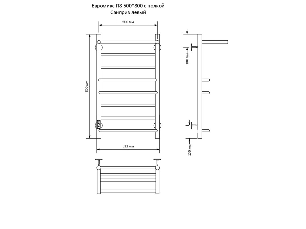 Полотенцесушитель — 1 шт.; модуль скрытого подключения – 1 шт.; кабель для подключения к сети – 1 шт.; крепление к стене — 4 шт.; технический паспорт — 1 шт.