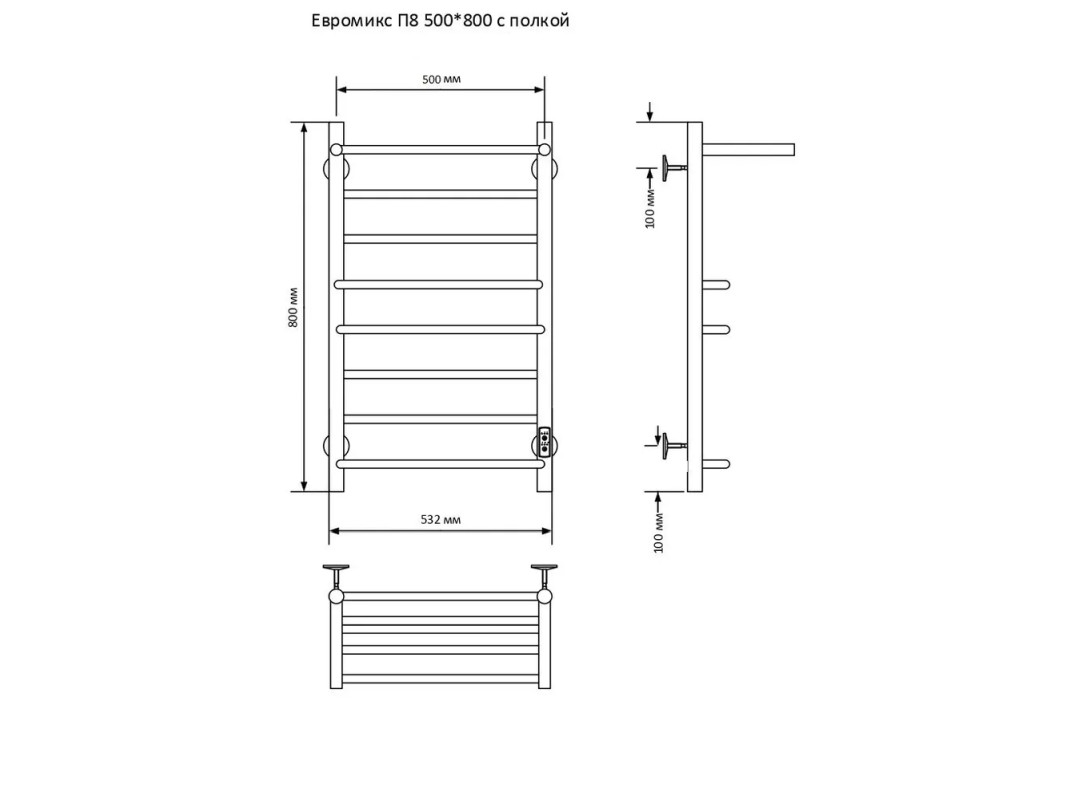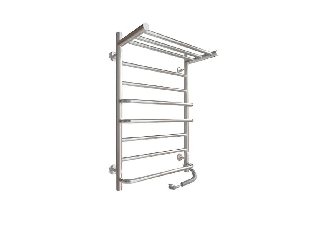 Электрический полотенцесушитель САНПРИЗ Евромикс П8 500х800 с полкой подключение универсальное изготовлен из высококачественной нержавеющей стали AISI 304, зарекомендовавшая себя надежностью и длительностью эксплуатации. Толщина стенки трубы 1,5 мм., оптимальна для изделия с сухим ТЭНом (экономия энергии, долговечность). Полотенцесушитель электрический Евромикс имеет нагревательный элемент кабельного типа, компактный блок управления оснащен терморегулятором с возможностью регулировки температуры и таймером отключения. Постоянное излучаемое тепло способствует созданию одинаковой и комфортной температуры в помещении. Полотенцесушитель удобно размещается на стене и станет украшением интерьера ванной комнаты