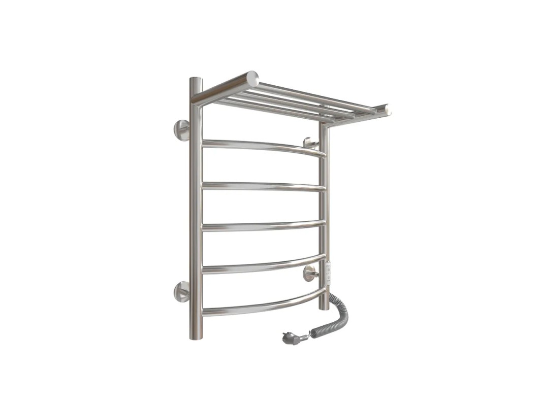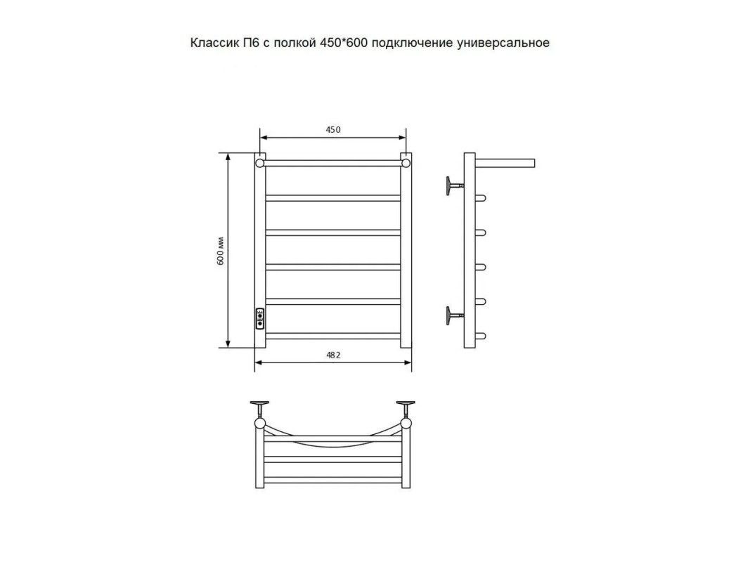 Электрический полотенцесушитель с полкой САНПРИЗ Классик П6 450х600 подключение универсальное изготовлен из высококачественной нержавеющей стали AISI 304, зарекомендовавшей себя надежностью и длительностью эксплуатации. Толщина стенки трубы 1,5 мм., оптимальна для изделия с сухим ТЭНом (экономия энергии, долговечность). Полотенцесушитель электрический Классик имеет нагревательный элемент кабельного типа, оснащен терморегулятором с возможностью регулировки температуры и таймером отключения. Постоянное излучаемое тепло способствует созданию одинаковой и комфортной температуры в помещении. Полотенцесушитель удобно размещается на стене и станет украшением интерьера ванной комнаты