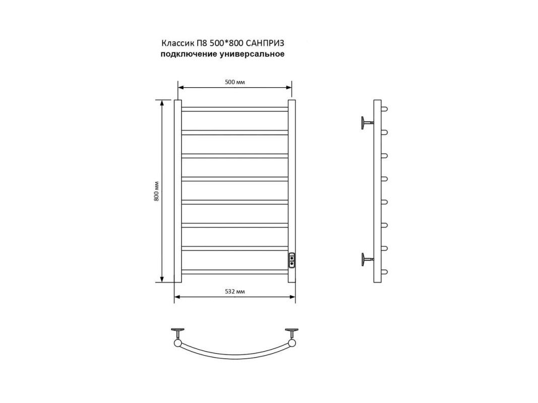 Электрический полотенцесушитель САНПРИЗ Классик П8 500х800 подключение универсальное изготовлен из высококачественной нержавеющей стали AISI 304, зарекомендовавшей себя надежностью и длительностью эксплуатации. Толщина стенки трубы 1,5 мм., оптимальна для изделия с сухим ТЭНом (экономия энергии, долговечность). Полотенцесушитель электрический Классик имеет нагревательный элемент кабельного типа, оснащен терморегулятором с возможностью регулировки температуры и таймером отключения. Постоянное излучаемое тепло способствует созданию одинаковой и комфортной температуры в помещении. Полотенцесушитель удобно размещается на стене и станет украшением интерьера ванной комнаты