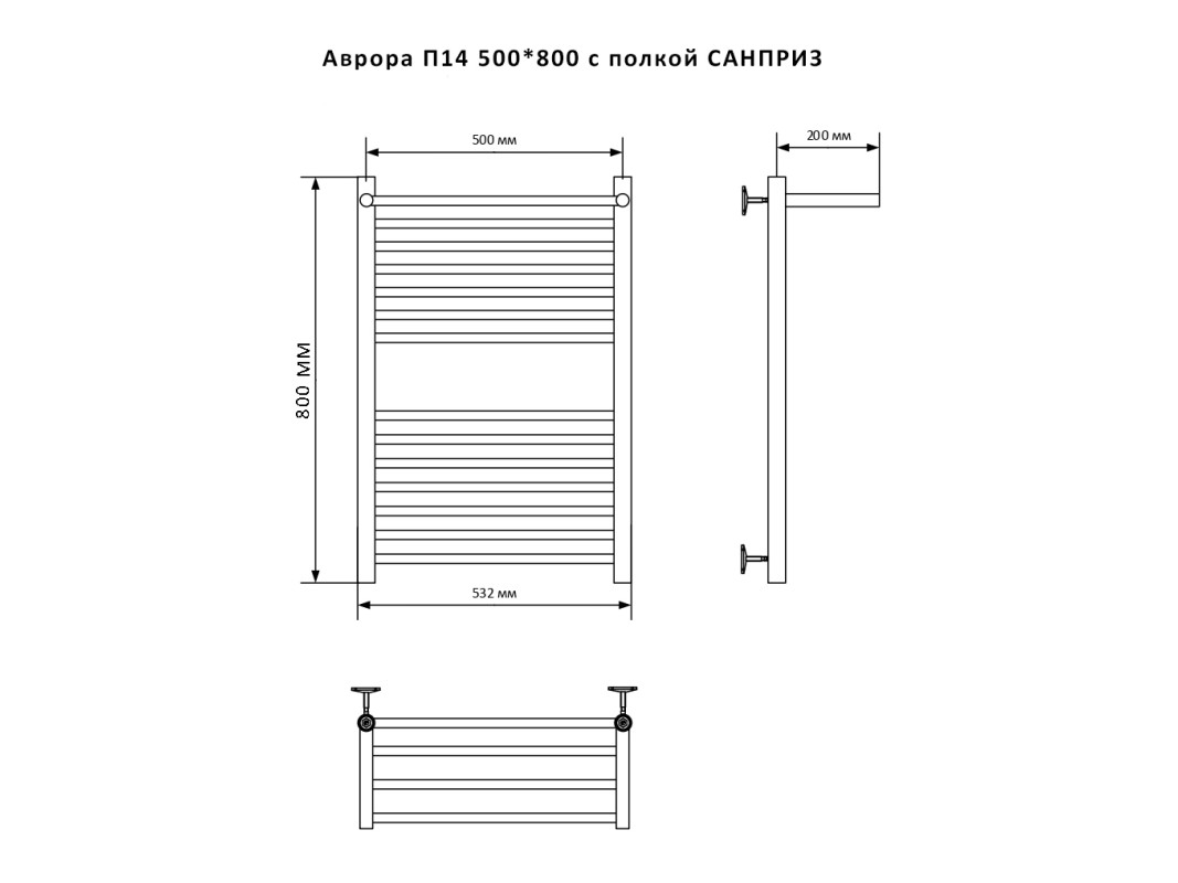 Полотенцесушитель — 1 шт., заглушка 1/2″ НР – 1 шт., воздухоотводчик 1/2″ НР – 1 шт., крепление к стене — 4 шт., гарантийный талон — 1 шт.