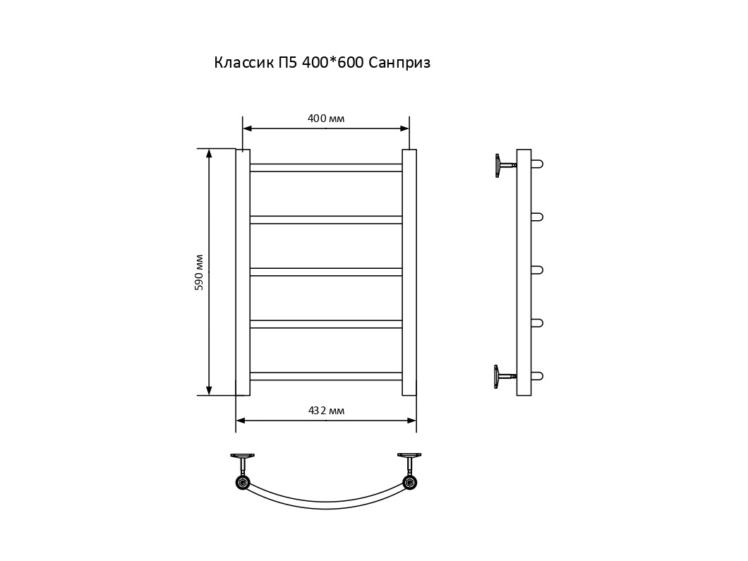 Полотенцесушитель — 1 шт., заглушка 1/2″ НР – 1 шт., воздухоотводчик 1/2″ НР – 1 шт., крепление к стене — 4 шт., гарантийный талон — 1 шт.