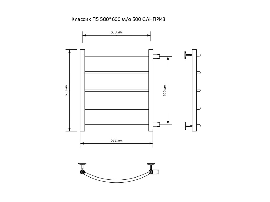 Полотенцесушитель — 1 шт., заглушка 1/2″ НР – 1 шт., воздухоотводчик 1/2″ НР – 1 шт., крепление к стене — 4 шт., гарантийный талон — 1 шт.