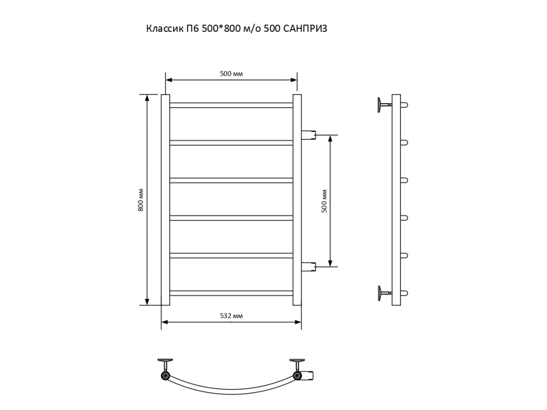 Полотенцесушитель — 1 шт., заглушка 1/2″ НР – 1 шт., воздухоотводчик 1/2″ НР – 1 шт., крепление к стене — 4 шт., технический паспорт — 1 шт.
