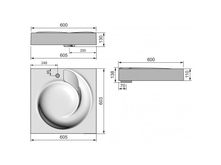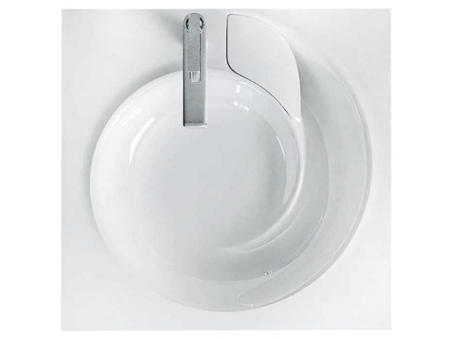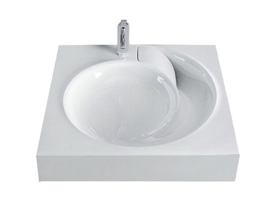 Чаша раковины с декоративной заглушкой, имеет современный дизайн, создает впечатление водоворота воды при сливе.