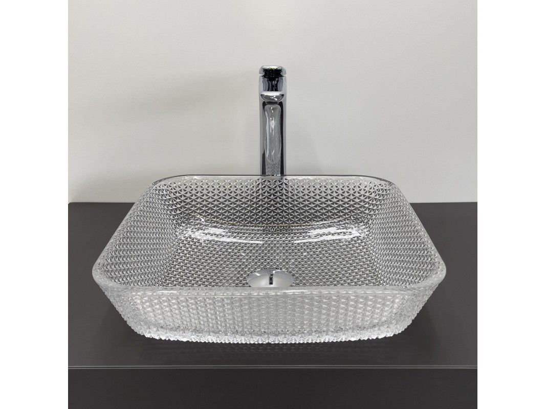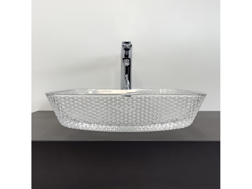 Раковина выполнена из бесцветного прозрачного стекла, что придает ей современный и элегантный вид. Внутренняя поверхность гладкая, а внешняя с гранением, что добавляет изысканности и шарма.