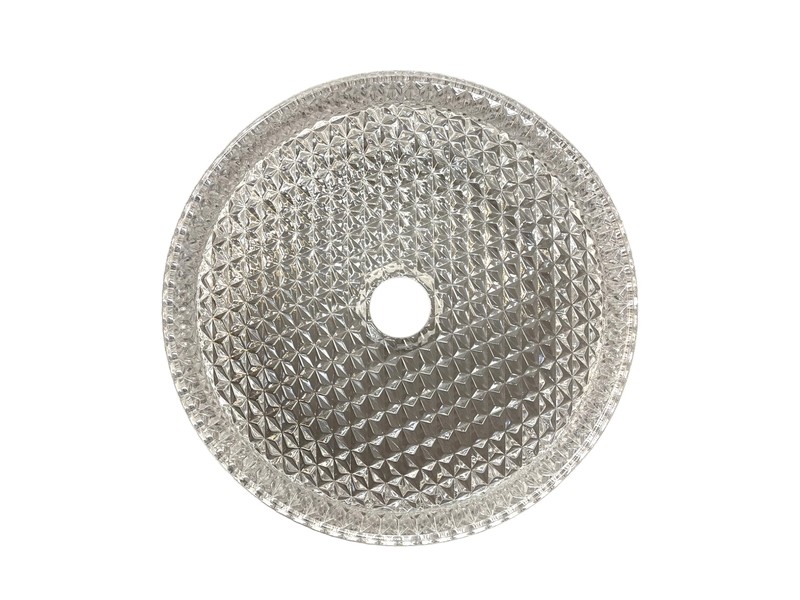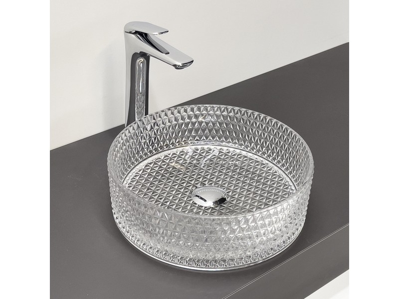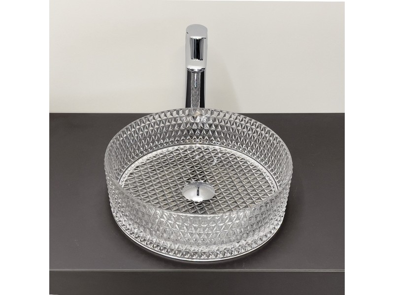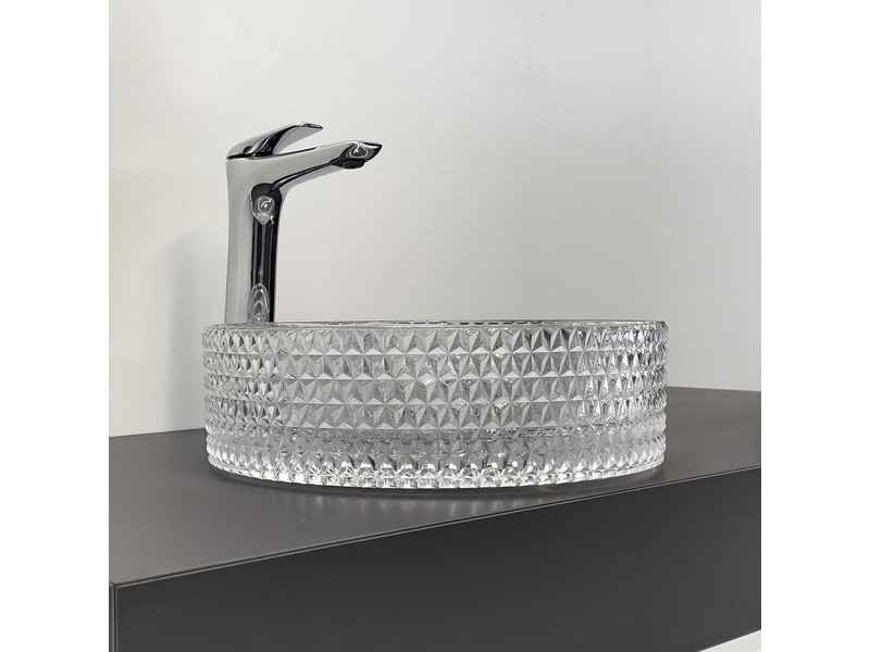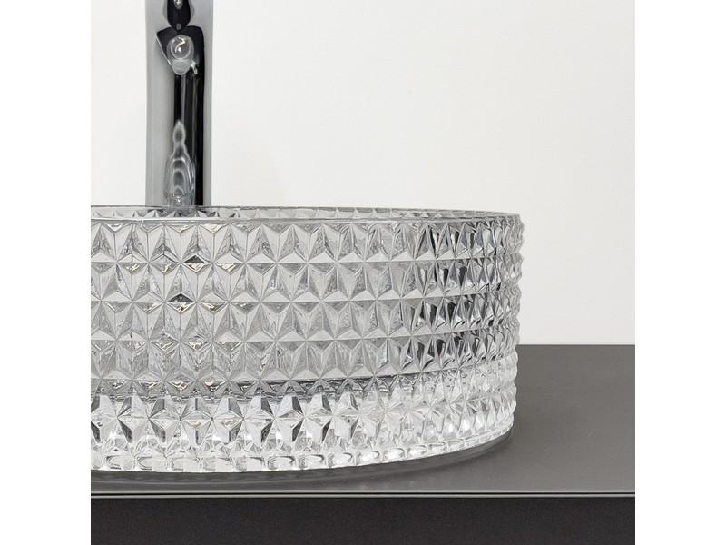 Мебельный умывальник из прозрачного закаленного стекла для установки на тумбу или столешницу. Внутренняя поверхность гладкая, внешняя c гранением.