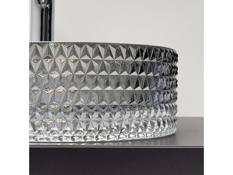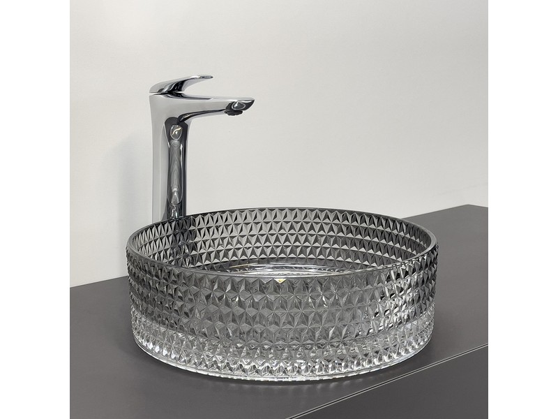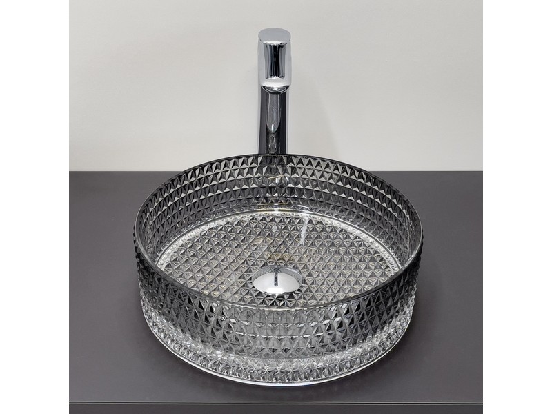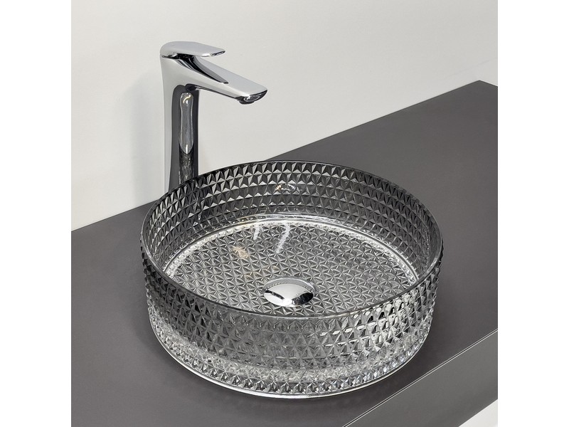 Мебельный умывальник из тонированного прозрачного закаленного стекла для установки на тумбу или столешницу. Внутренняя поверхность гладкая, внешняя гранением.