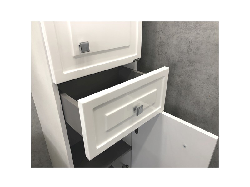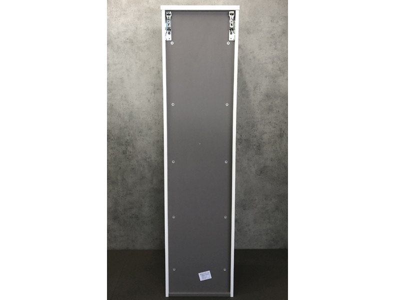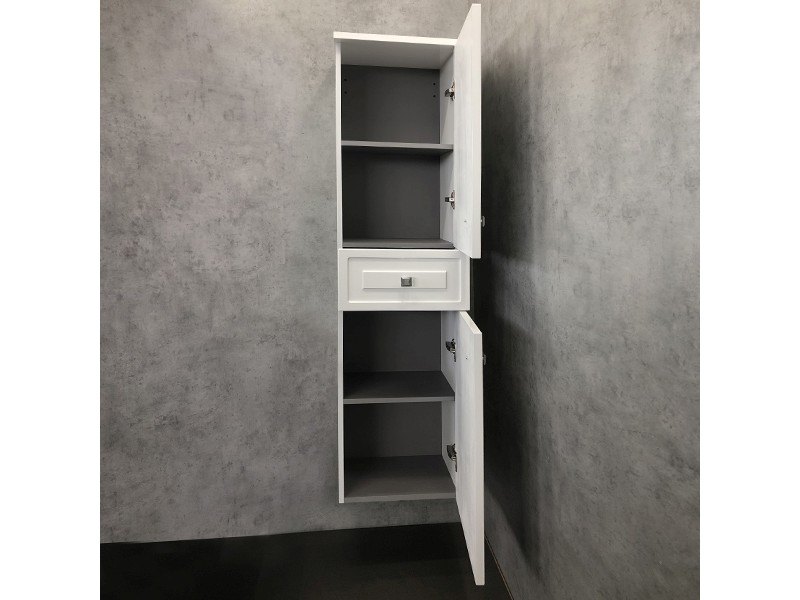 Подвесная шкаф-колонна отличное решение для хранения разных предметов необходимых в ванной комнате. Створки открываются влево, оснащены петлями с плавным закрыванием. Фасады покрыты белой глянцевой эмалью. За верхней и нижней дверцей по одной полке.