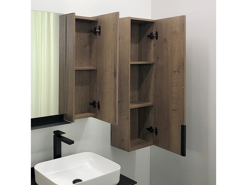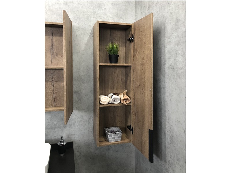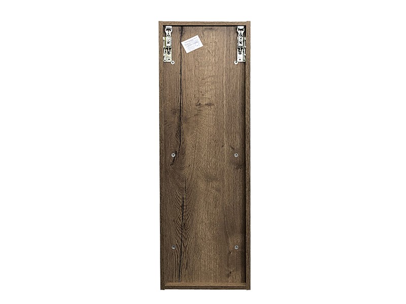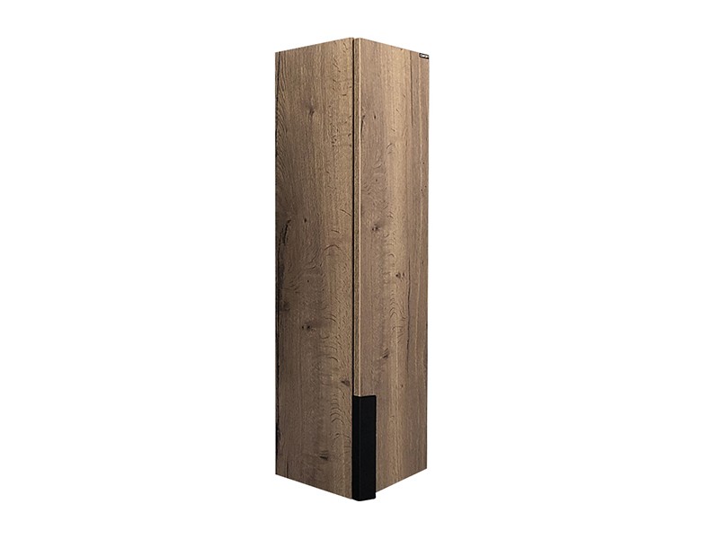 Подвесная полуколонна изготовлена из влагостойкого ЛДСП цвета Дуб темный. За одной створкой две горизонтальные полки. Ручка из окрашенного в черный цвет металла. Полуколонна универсальна, может быть подвешена в правом и левом варианте.