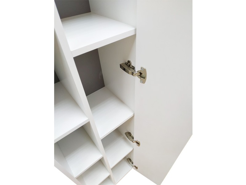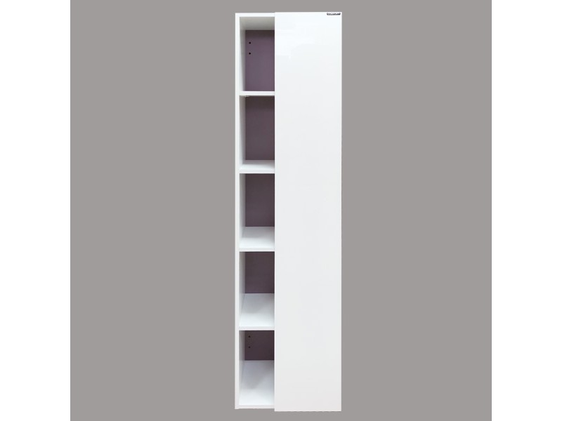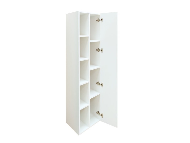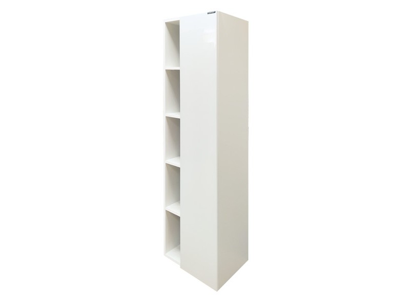 Подвесная шкаф колонна с одной створкой и пространством для открытого хранения. Створка оснащена петлями с плавным закрыванием. Фасад из МДФ покрыт белой глянцевой эмалью. За створкой три горизонтальные полки.